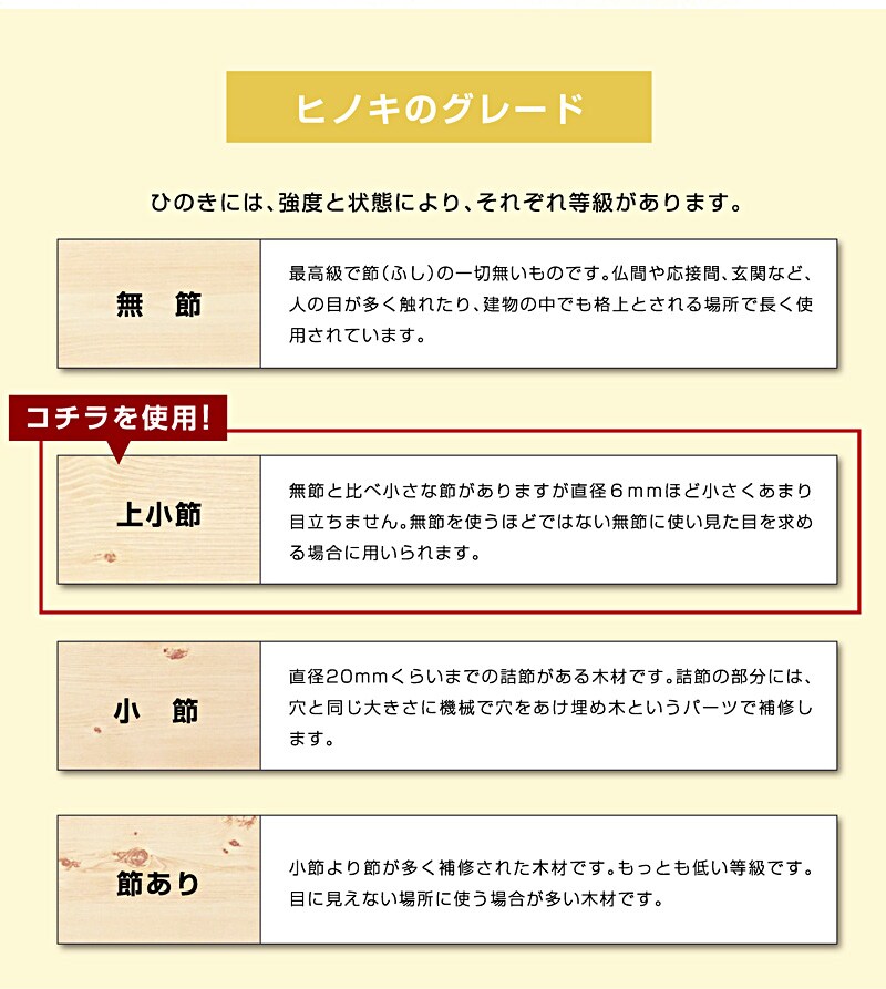 | 材質 | フレーム:ひのき(上小節)国産 すのこ:桐材 |