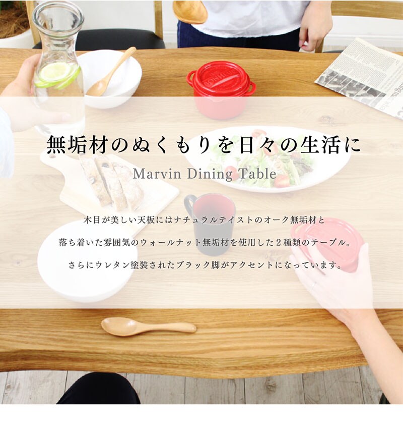 | 材質 | 天板:オーク/ウォールナット無垢材 脚部:ラバーウッド無垢材 |