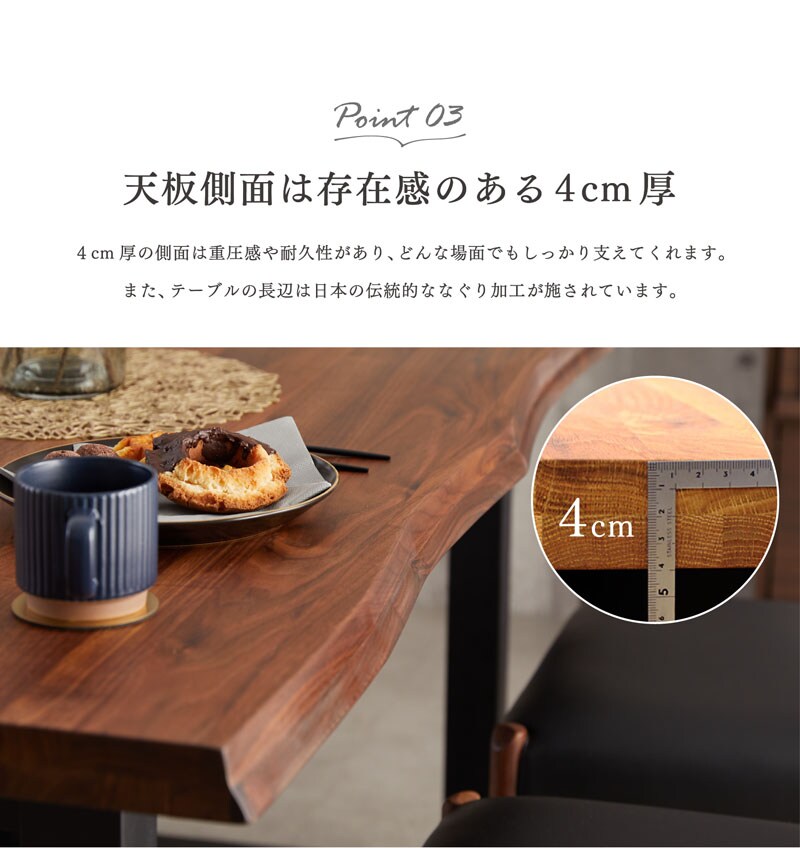 | 特徴 | ・木目が美しいモダンなデザイン ・無垢材を贅沢に使用 ・ゆったりチェアを2脚セットできる広さ ・脚幅は4段階調節可能 ・重圧感ある2層構造の4cm厚 ・日本の伝統的ななぐり加工 |