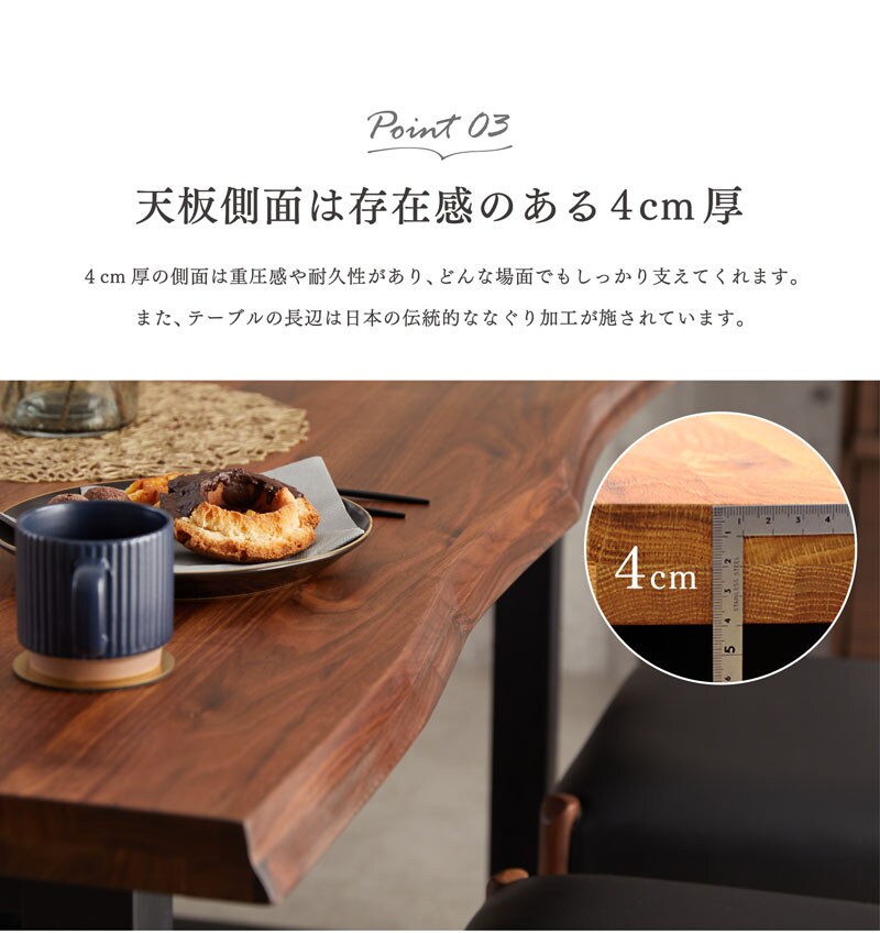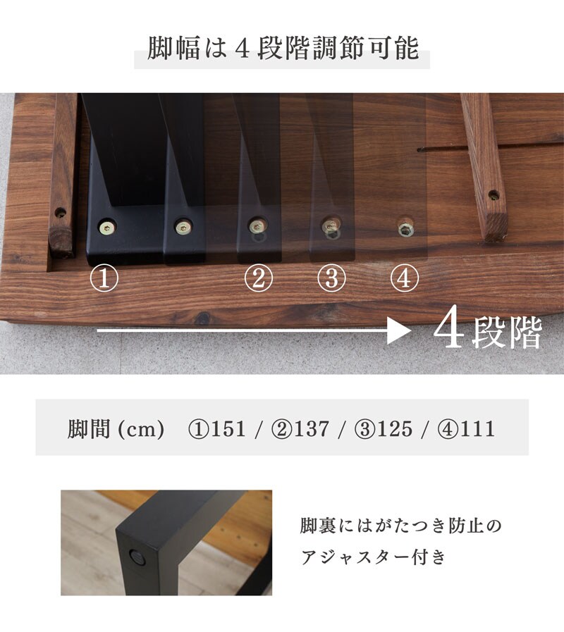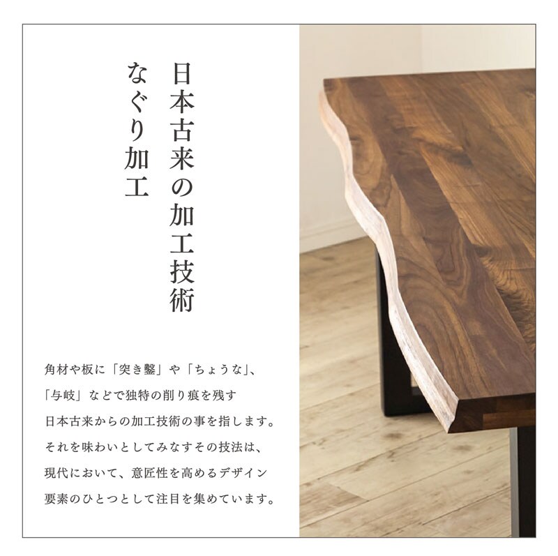| 特徴 | ・木目が美しいモダンなデザイン ・無垢材を贅沢に使用 ・ゆったりチェアを2脚セットできる広さ ・脚幅は4段階調節可能 ・重圧感ある2層構造の4cm厚 ・日本の伝統的ななぐり加工 |