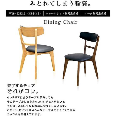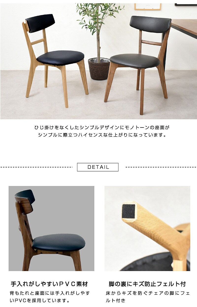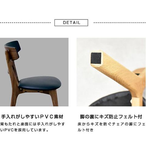 | 特徴 | ・丸みを帯びたやわらかい印象のダイニングチェア ・背もたれと座面はPVC生地でお手入れ簡単。 ・すっきりとしたアームレスのダイニングチェアです。 ・背もたれの曲線がやわらかく包み込まれるような座り心地。 ・座面と同じPVC張りでクッション性を持たせ、使用感よく仕上げております。 |