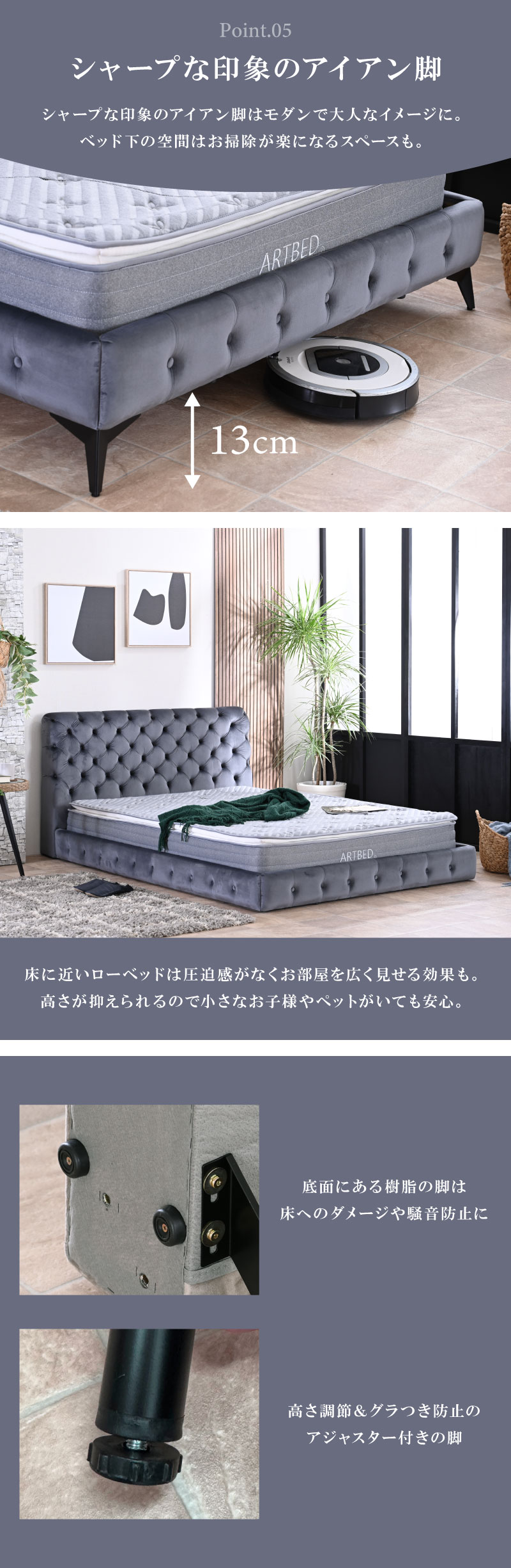 ・高級感あふれる見た目や抜群の保温性が特徴のベロア調生地 ・ボタン留めを施すことでチェスターフィールド風のベッドフレームに ・まるで高級ホテルのようなハイタイプのヘッドボードは背もたれとしてもご使用いただけます ・シャープな印象の高さ13cmのアイアン脚 ・ベッド下の空間はお掃除ロボットがスムーズに通るスペースがあります ・脚は取り外し可能でロータイプにするとお部屋が広く感じられます ・底面にある樹脂の脚は設置によるダメージや騒音を軽減します ・すのこ仕様の通気性に加えて、弾力性のあるウッドスプリング式を採用 |