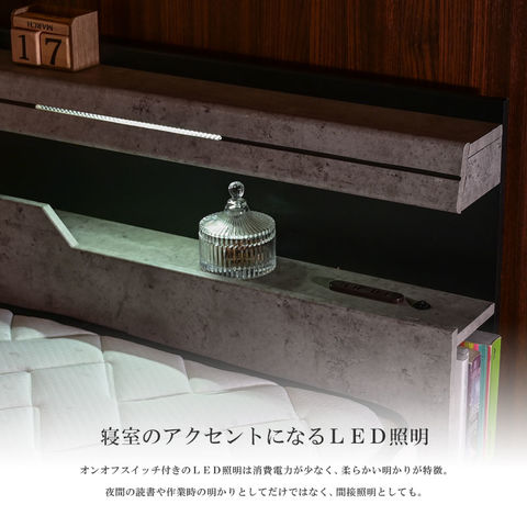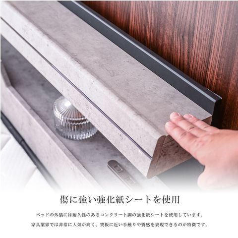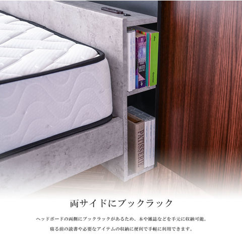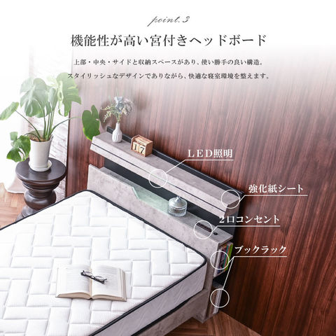 | 特徴 | ・ホテルライクなインテリアデザイン ・丈夫で湿気を逃す環境にやさしいすのこ ・寝室のアクセントになるLED照明 ・便利な2口コンセント ・両サイドにブックラック ・床下の便利なマルチスペース |