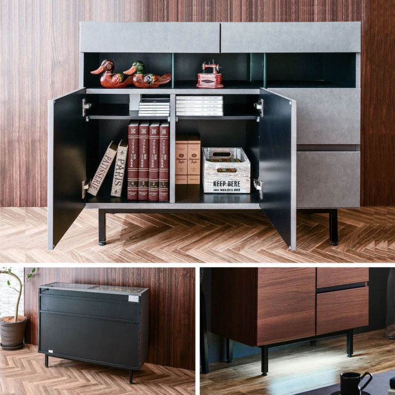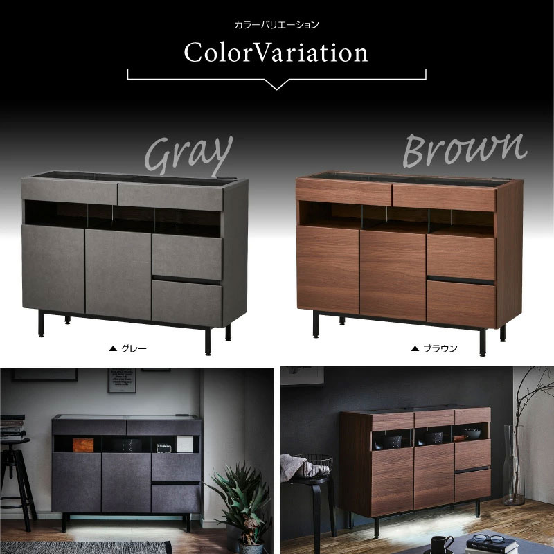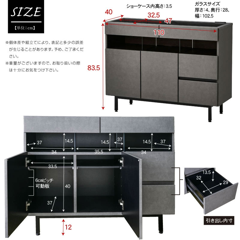 | 特徴 | ・完成品(脚のみお客様にて取付け) ・フルオープンレール引き出し ・天板は強化ガラス張りでショーケースとして ・ショーケース引き出し底はフェルト付き ・充電に便利な2口コンセント ・足元はLED間接照明 ・観音開きの収納棚は可動式で便利 ・右側収納は深型でたっぷり収納可能 |