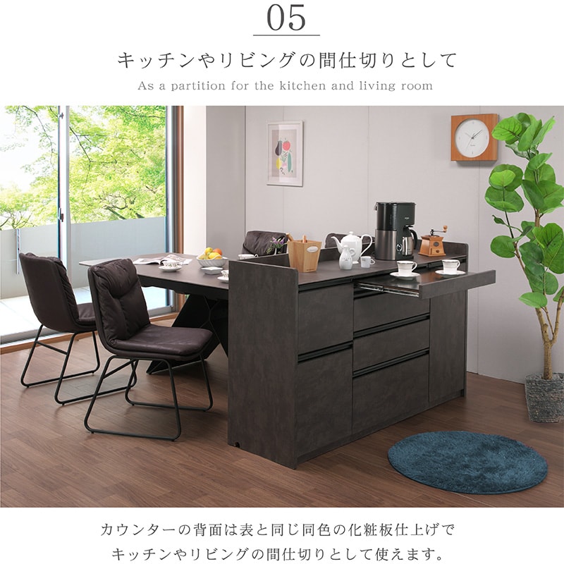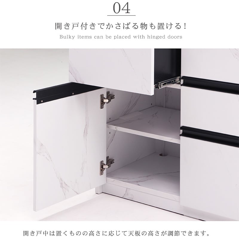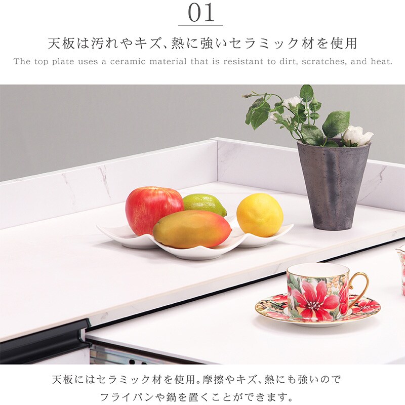 | 特徴 | ・セラミック天板で熱にも強くフライパンや鍋なども置ける。 ・フルスライドレールで開け閉めが楽 ・キッチン用家電が使える2口コンセント付き ・スライド天板は作業スペースとして使えます。 ・モダン空間に合う2カラー2サイズの展開 ・収納にも便利な小引き出し付き。 ・スタイリッシュなブラックの引手 |