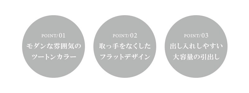 | 特徴 | ・モダンな雰囲気のツートンカラー ・取っ手をなくしたフラットデザイン ・出し入れしやすい大容量の引出し |