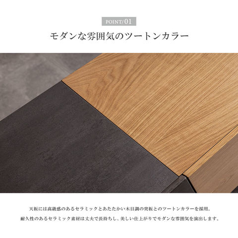 | 材質 | 【天板】セラミック、突板 【脚】スチール 【前板&側面&BK部分】3Dシート 【木部】突板 |