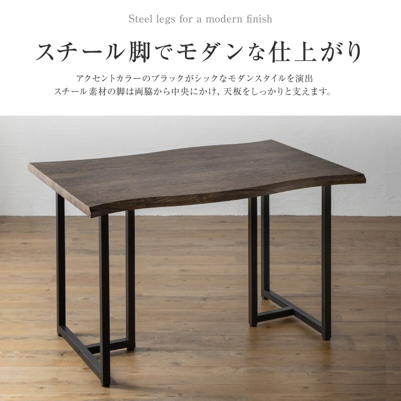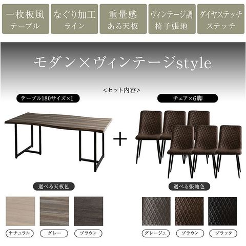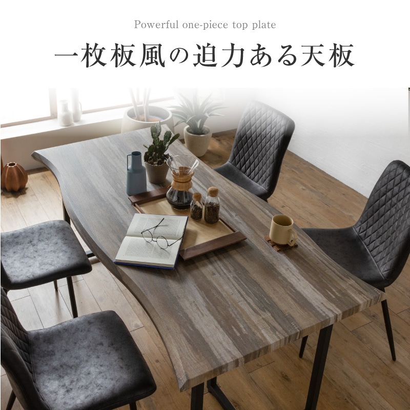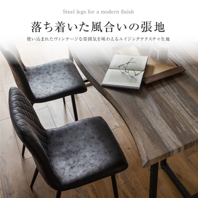 | 特徴 | ・一枚板風の天板で迫力ある佇まい ・テーブル天板の縁部分はナグリ加工を施し躍動感ある仕上がり ・30mm厚の重量感ある天板が高級感をプラス ・テーブル脚はスチール製でおしゃれなテーパードレッグ ・安定感がありロの字になっている脚は強度にも優れています ・チェアの背もたれはデザイン性が高いダイヤステッチ ・チェア張地はヴィンテージ風のレザーファブリック ・テーブル脚はスチール製でおしゃれなテーパードレッグ |
