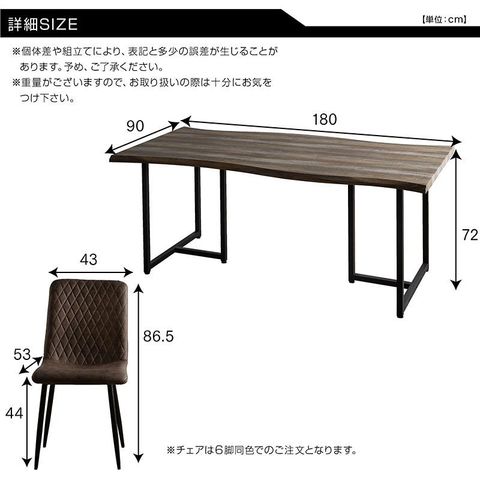 | サイズ(cm) | テーブル:W180×H72×D90 チェア:W43×D53×H86.5(SH44) |