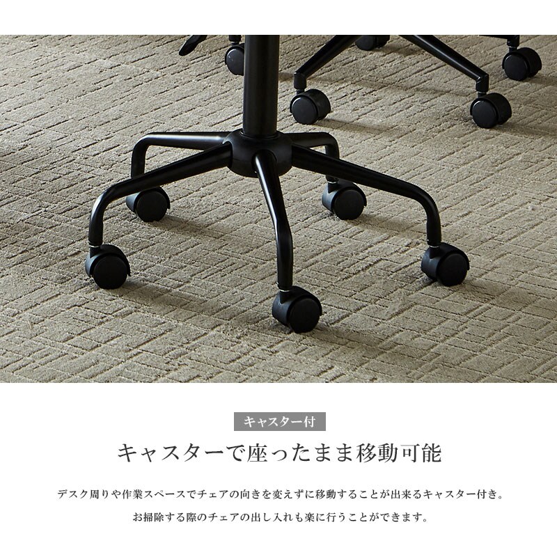 | 特徴 | ・レザーとファブリックの甘辛ツートン生地 ・レバーでラクラク上下昇降 ・立ち座りも快適な360度回転座面 ・キャスターで座ったまま移動可能 |