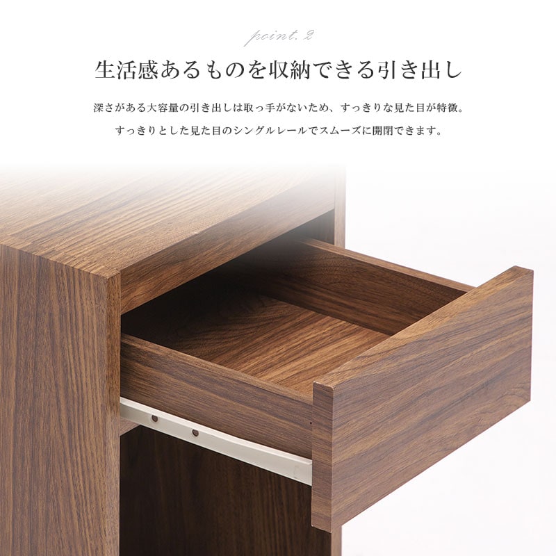 | 特徴 | ・充電に便利な2口コンセント付き ・生活感あるものを収納できる引き出し ・本や雑誌を収納できるオープンスペース ・傷に強い強化紙シートを使用 |