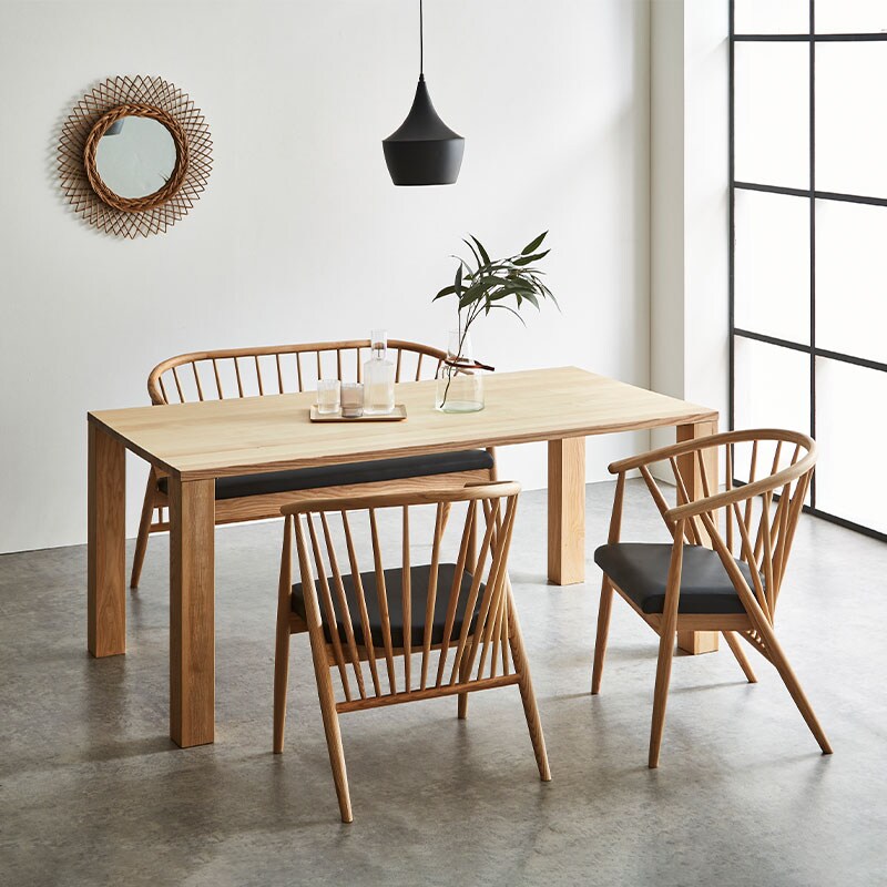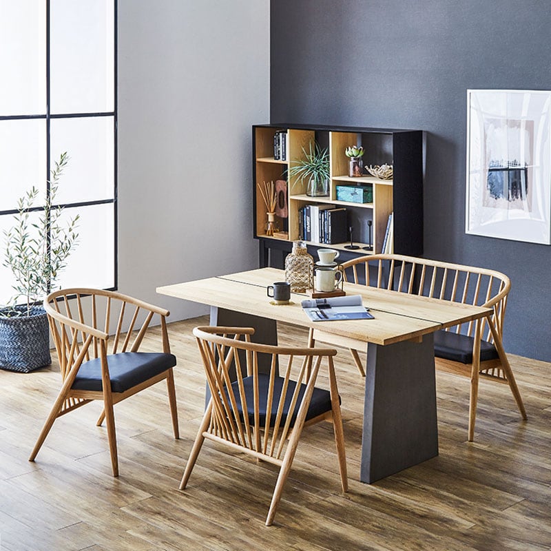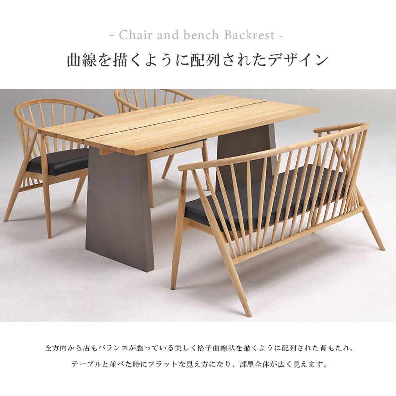 | 特徴 | ・頑丈で木目が美しいアッシュ天然無垢材を使用 ・曲線を描くように配列されたデザイン ・耐久性のあるPVCウレタンの座面 |