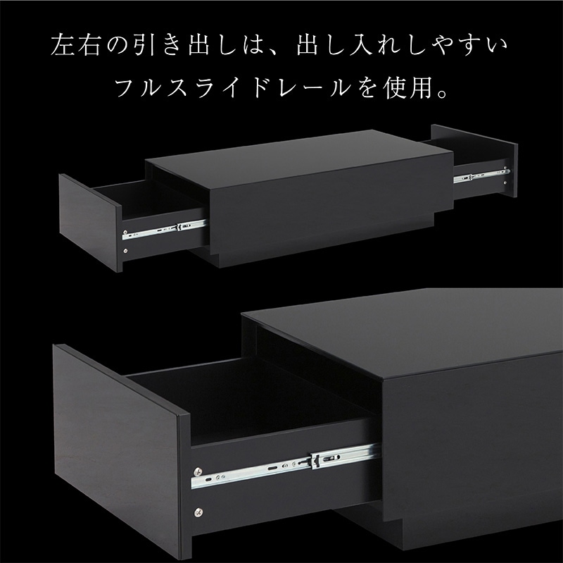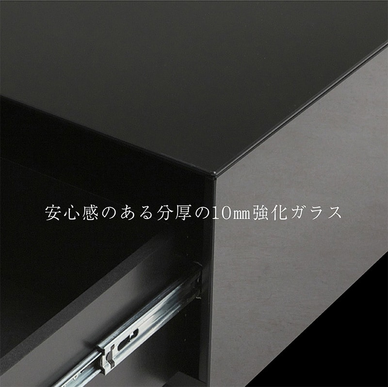 | 商品説明 | ・周りを映し込むガラス張りテーブル ・ブラックの強化ガラスで大人の雰囲気 ・両サイド引出し付きで大容量 ・奥の物まで楽に取り出せることができるフルオープンレール採用 |