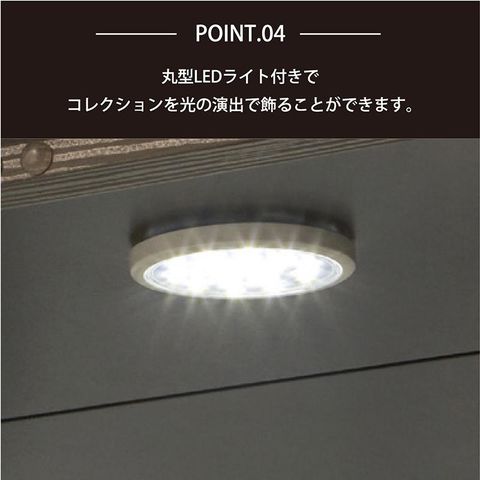 | 特徴 | 【ほぼ完成品】LEDライトお客様取り付け ・センスのいいスタイリッシュなコレクションボード ・大切なコレクションを優雅に美しく演出 ・コンパクトサイズ ・LEDライトでお部屋をカッコよく決めます ・美しく飾ることができる、ガラスコレクションボードです。 |
