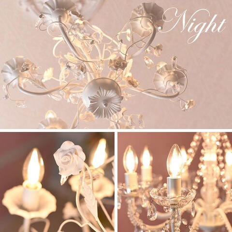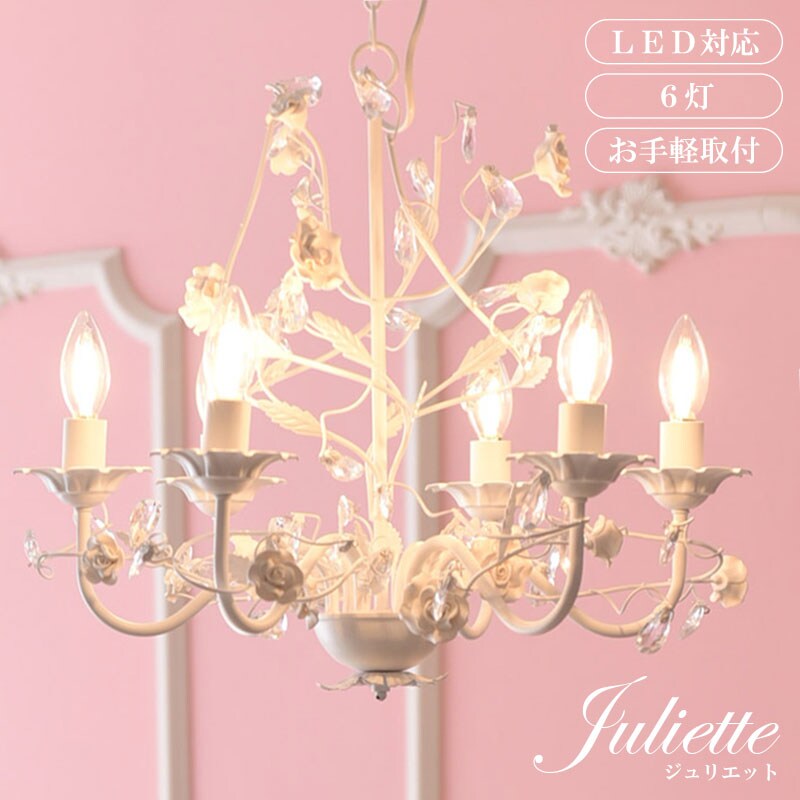 お手軽取付 LEDライト付 6灯 シャンデリア ホワイトローズ 姫系家具 大人かわいい アンティーク調 プリンセス ガーリー Juliette ジュリエット / ホワイトローズ / -ART