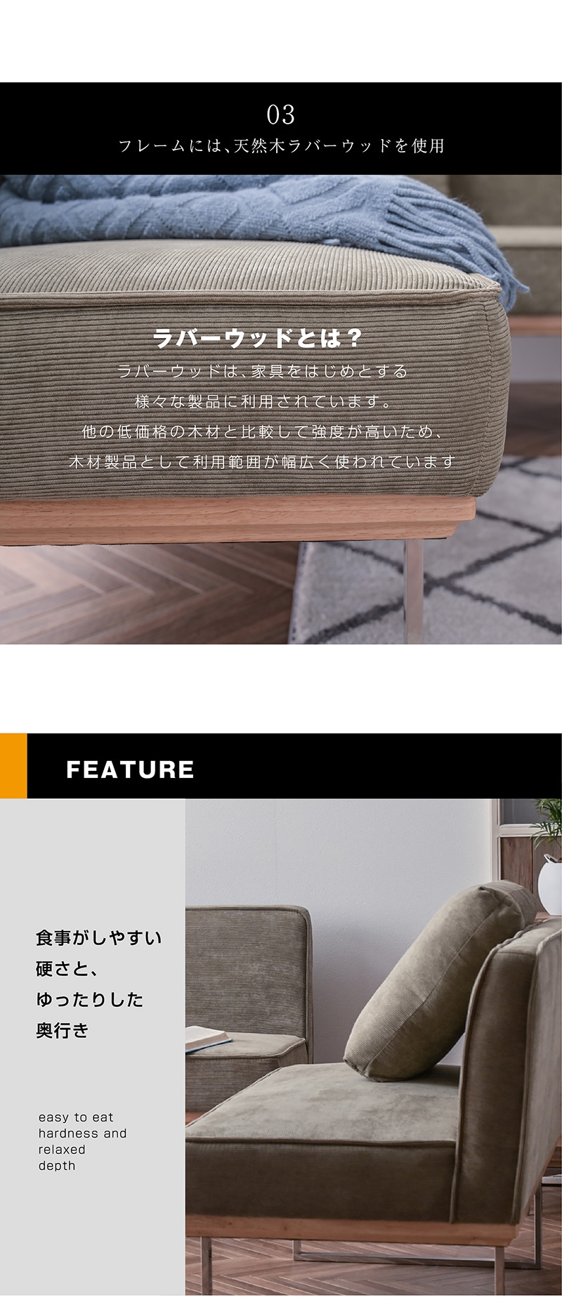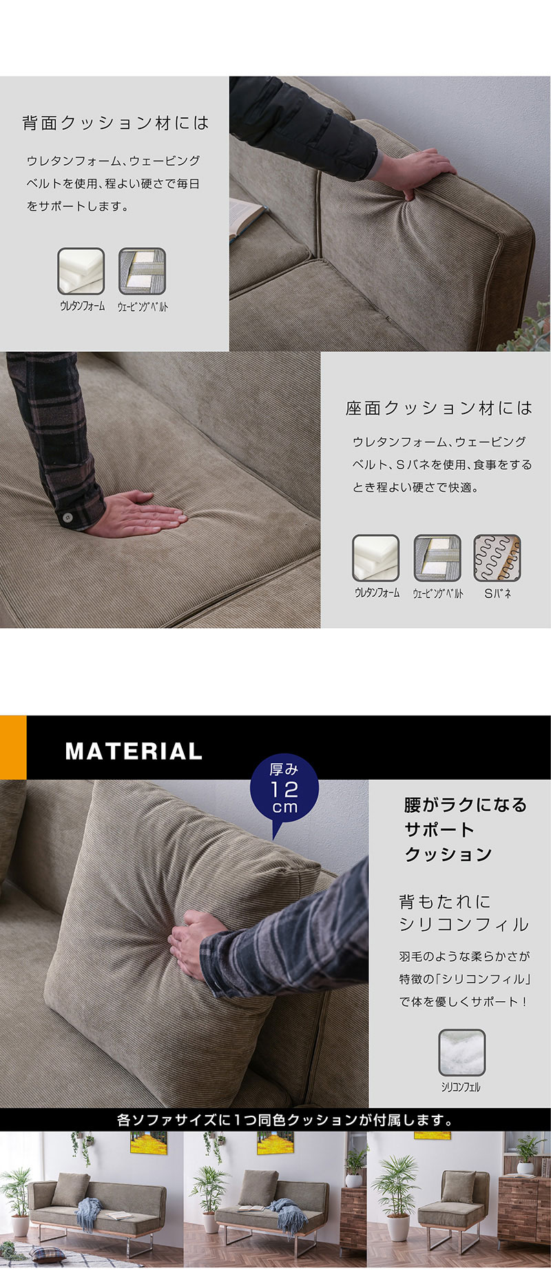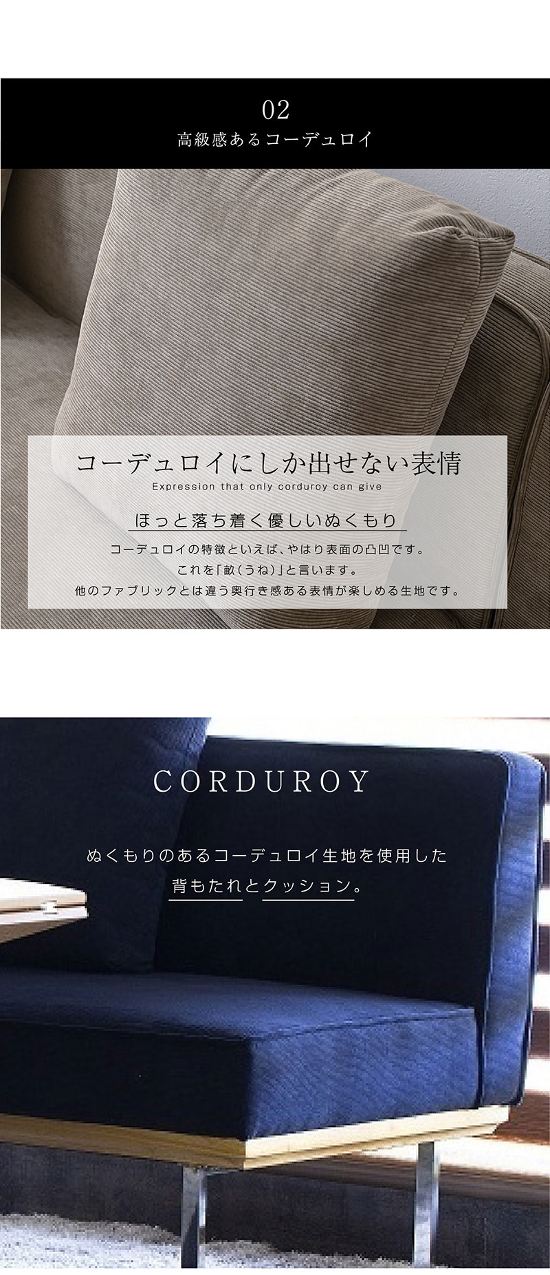 | 特徴 | スタイリッシュなデザインが美しい ダイニングソファ。 おしゃれで上質なコーデュロイ生地使用 夏はサラッと、冬は暖かい生地 座面内部はウレタンフォーム、S字スプリング、ウェービングベルト長時間座っても 疲れにくく快適な座り心地です。 背もたれクッションは羽毛のような柔らかさが特徴のシルコンフィルを採用。 |