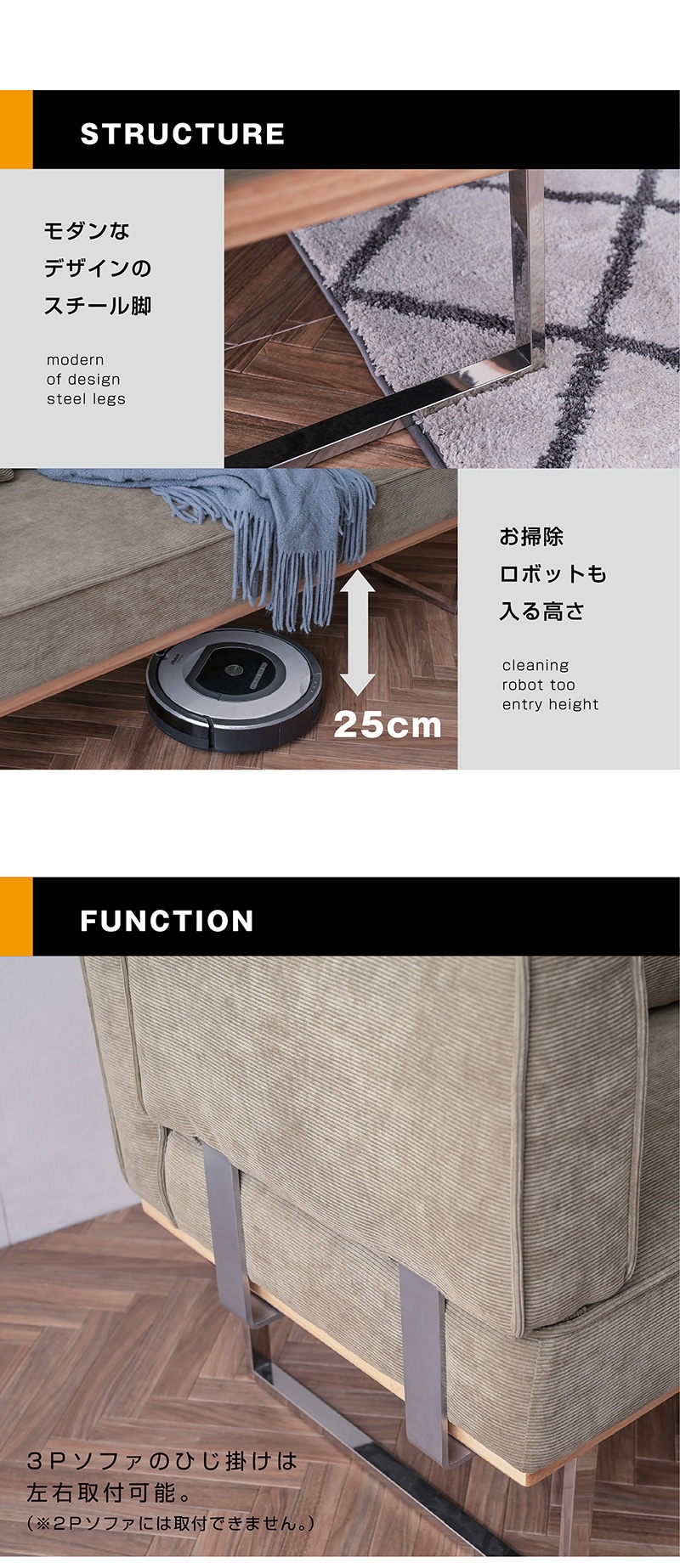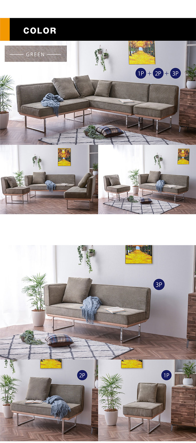 | 付属品 | 1P:クッション(小)1個付 2P:クッション(大)1個付 3P:クッション(大)1個付、肘1個付、左右取り付け可能 |