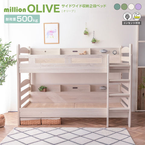 二段ベッド 2段ベッド 子供 大人 サイド宮付き コンパクト 耐荷重500kg 4色対応 ミリオンオリーブ 本体フレームのみ / ホワイトウォッシュ / -ART