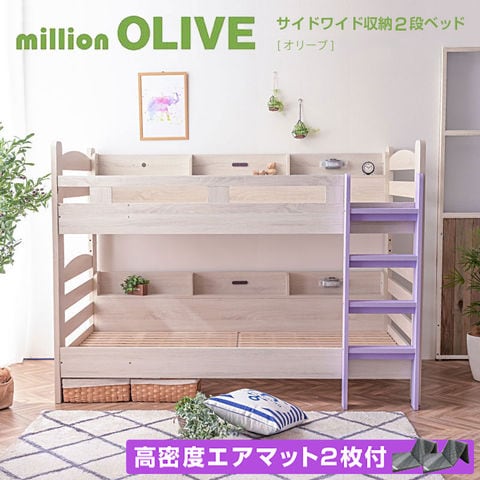 二段ベッド 2段ベッド 子供 大人 サイド宮付き コンパクト 耐荷重500kg 4色対応 ミリオンオリーブ / パープル / (三つ折りマットレス エア アート2枚付) -ART