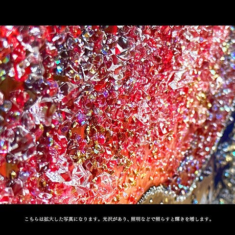 | 特徴 | ・水晶はハンドメイドで飾りつけし、高級感と立体感にこだわりました。 ・飾る場所の照明の色味によって雰囲気が変わります。 ・上品なゴールドカラーのフレームと裏面紐付き。 |