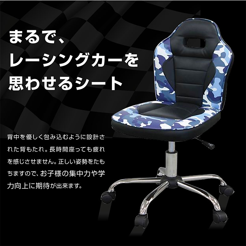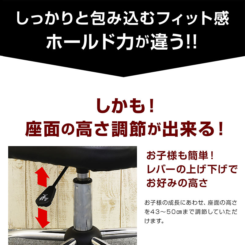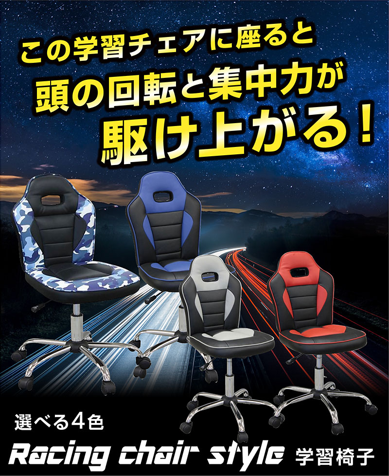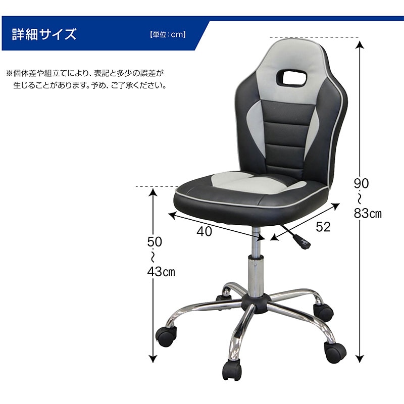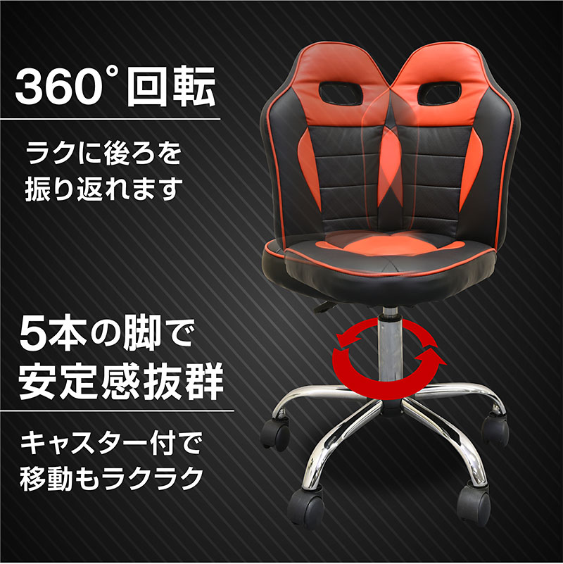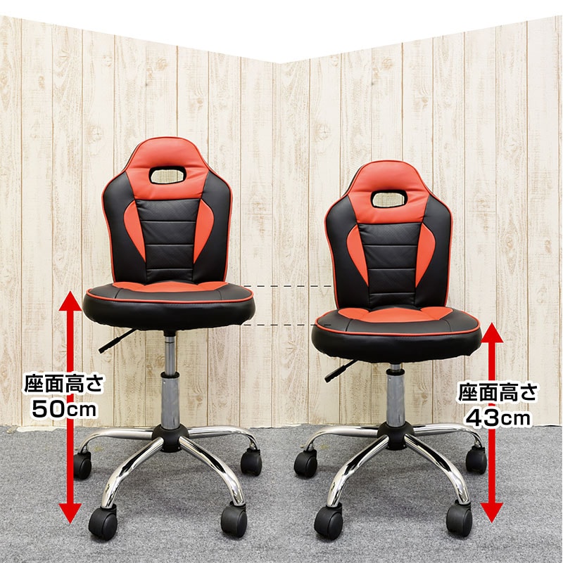 | 特徴 | 【組立品】 ・カッコイイレーシングタイプ、選べる4色 ・質感のよいPVCレザー仕様 ・水や汚れがついてもさット拭くだけ、お手入れ簡単 ・成長に合わせて高さ調節可能 ・5つのキャスターで回転も移動もスムーズ |