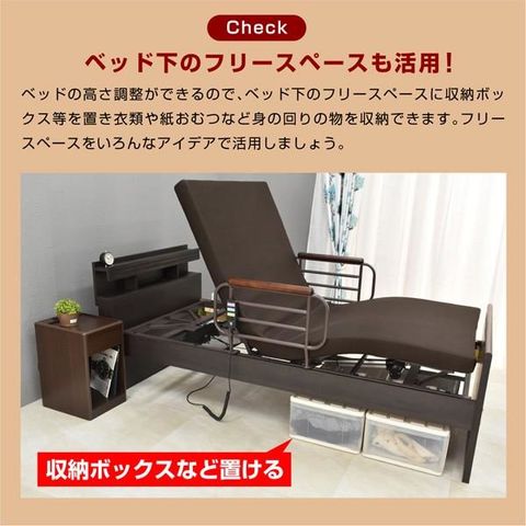 | 仕様 | 【組立品】 ・介護に適した電動ベッドです。 ・2モーター(背上げ・足上げ別可動可能) ・起き上がりをサポート、腰痛対策に ・便利なコンセントと照明付き ・コードリモコン付きで、お手元でラクラク操作が可能です。 ・手すり2個/専用マットレス(日本製)付き ・組立時に床板高さを6段階で選択可能 |