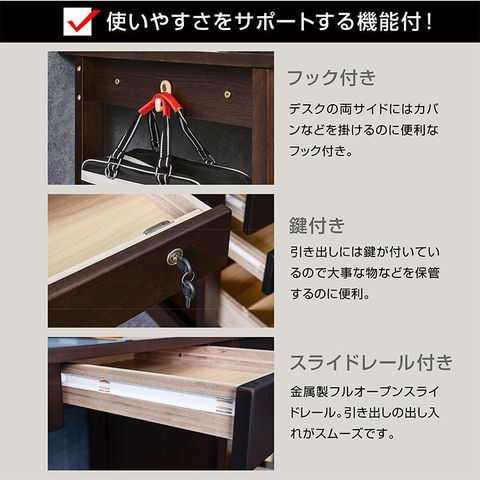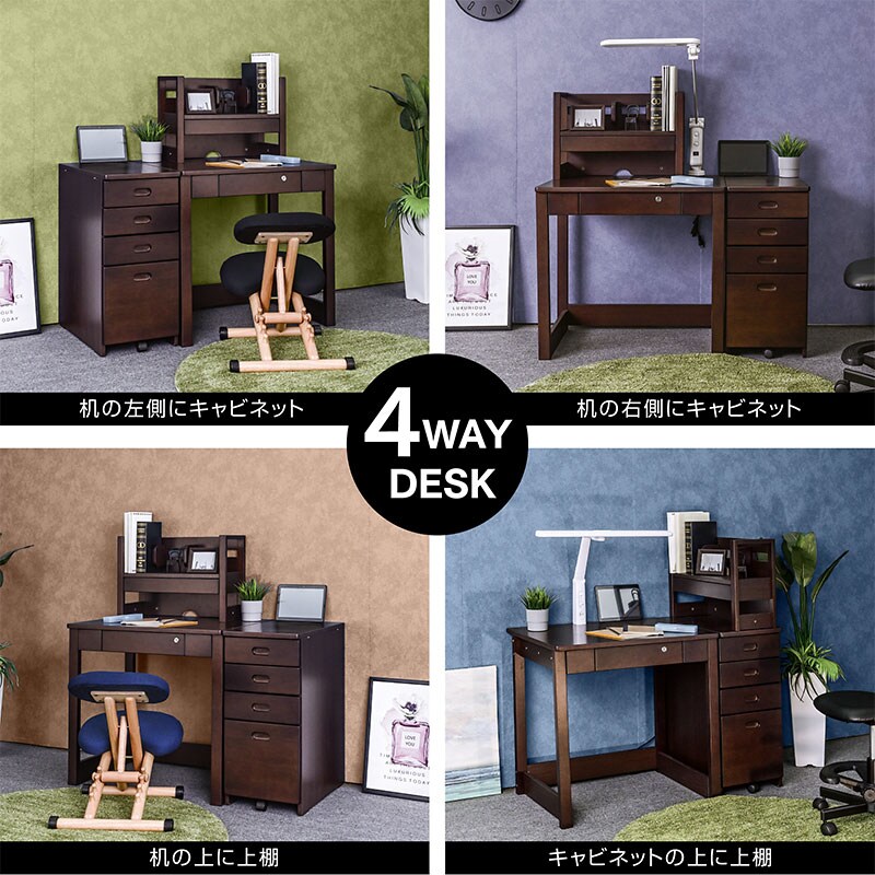| 特徴 | 【お客様組立て】【高品質】 ・組み立ては脚とキャスター取り付けですぐにお使い頂けます ・作りが丁寧なタイ生産品 ・お部屋やお好みに合わせて、組み合わせ自由自在 ・シンプルデザインで大人になってもずっと使える生涯デスク ・デスク、キャビネットはそれぞれ独立してお使い頂けます。 ・全段フルオープンレール |