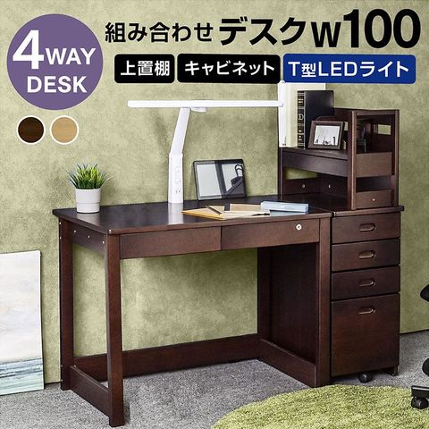 学習机 勉強机 ユニットデスク 4点セット(机W100+上棚+キャビネット) T型LEDライト付き 学習デスクセット ツインデスク コンパクト 大人 ヘンリー2 / ウォールナットブラウン / -ART