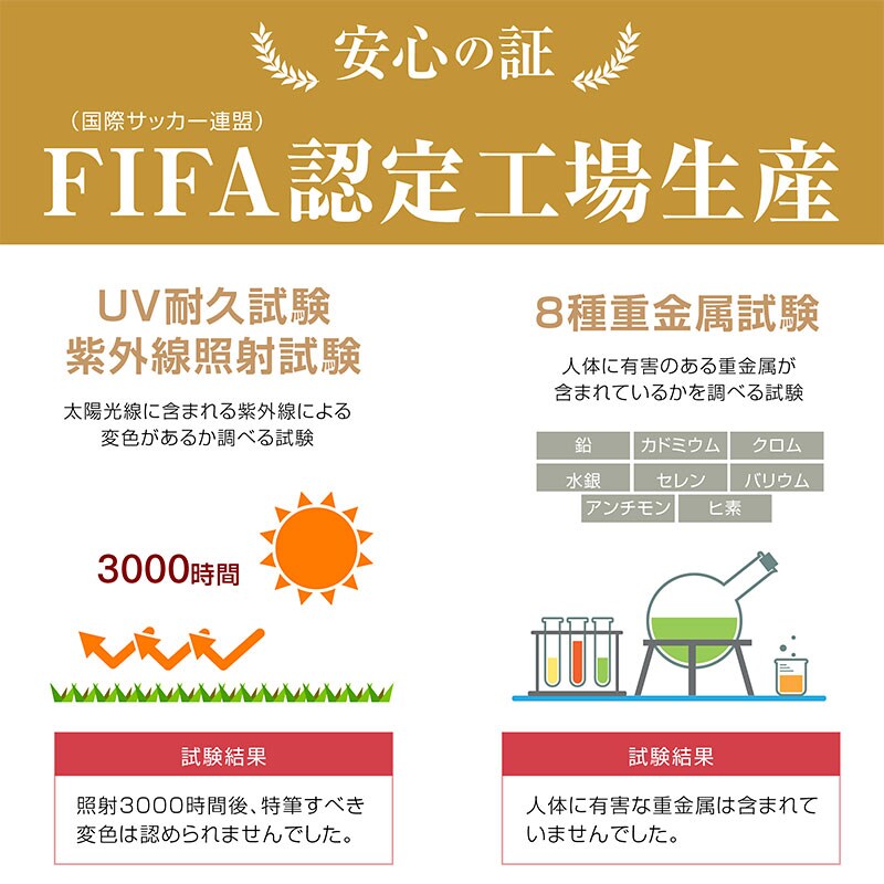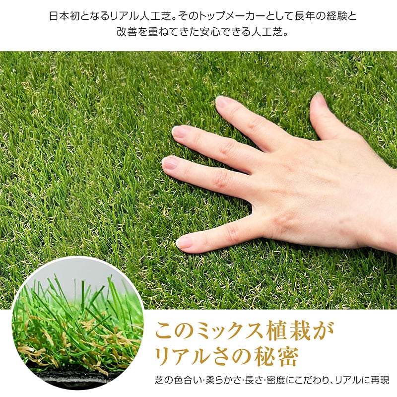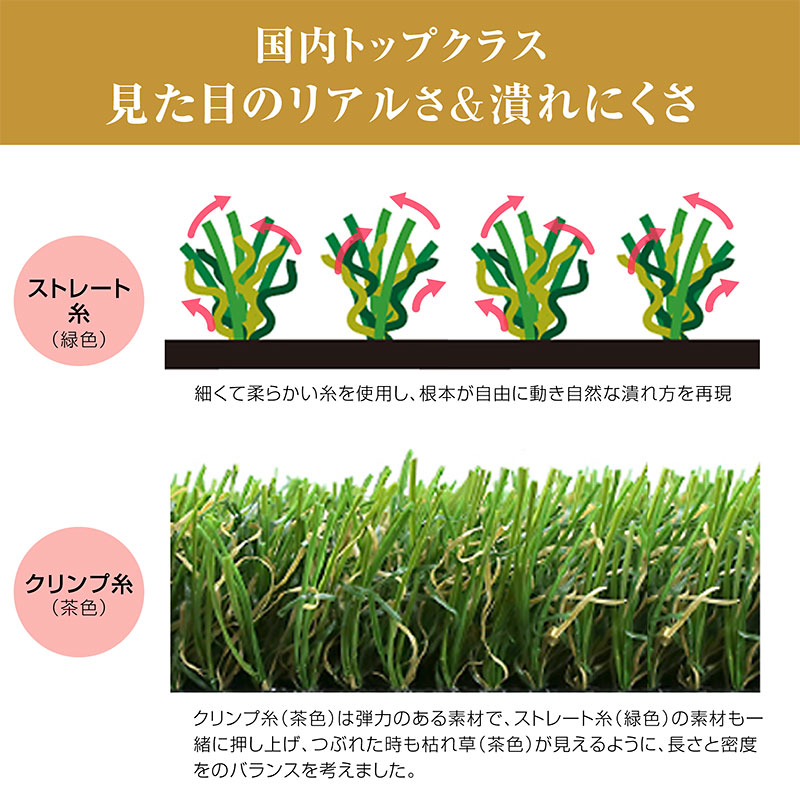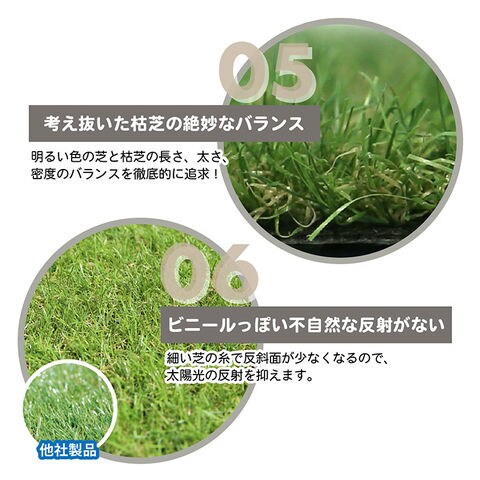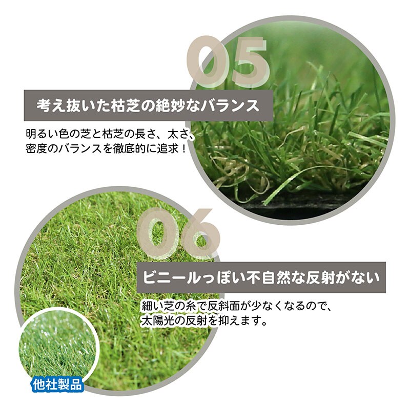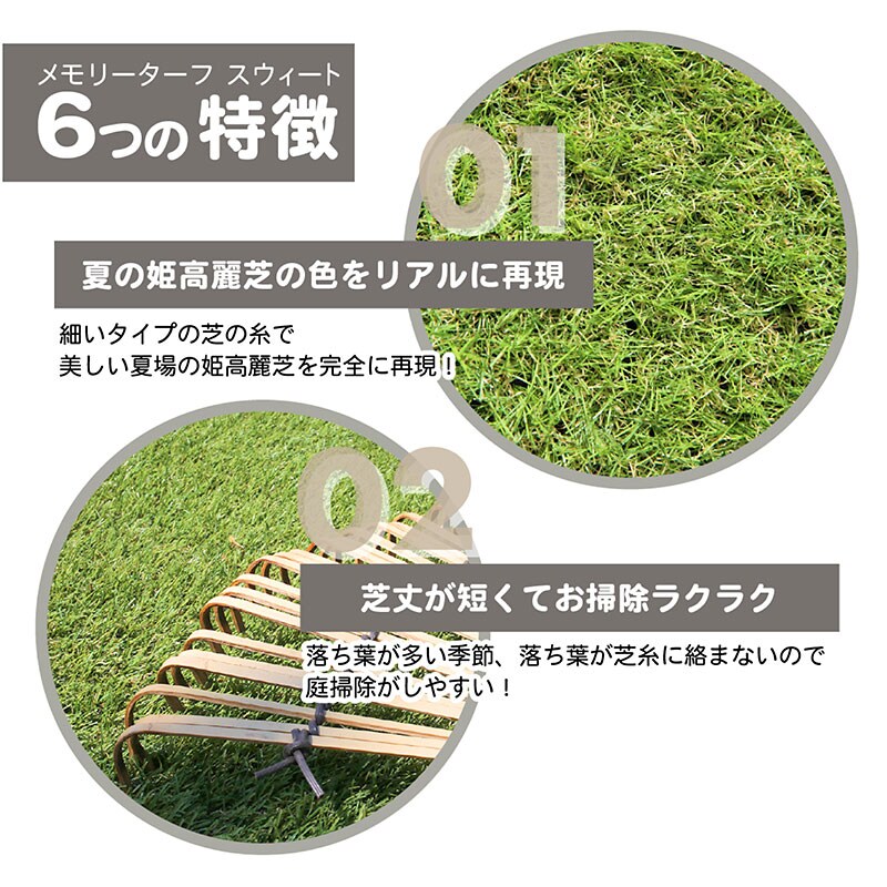 ・夏の姫高麗芝をリアルに再現 ・考え抜いた緑芝葉と枯芝葉の絶妙なバランスでつぶれにくい ・つなぎが目立ちにくく、ビニールっぽい不自然な反射がありません ・手触りがサラサラして気持ち良く、素足で歩いてもチクチクしにくい ・芝丈が短いのでスッキリ見え、ゴミが絡まりにくくお掃除が楽 ・UV耐久試験、紫外線照射試験、8種重金属試験クリア。 |