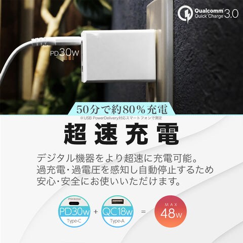 新半導体素材 窒化ガリウム採用 PD30W USB Type-Cポート + QC18W USB Type-Aポート かしこく超速充電 AC充電器 ホワイト