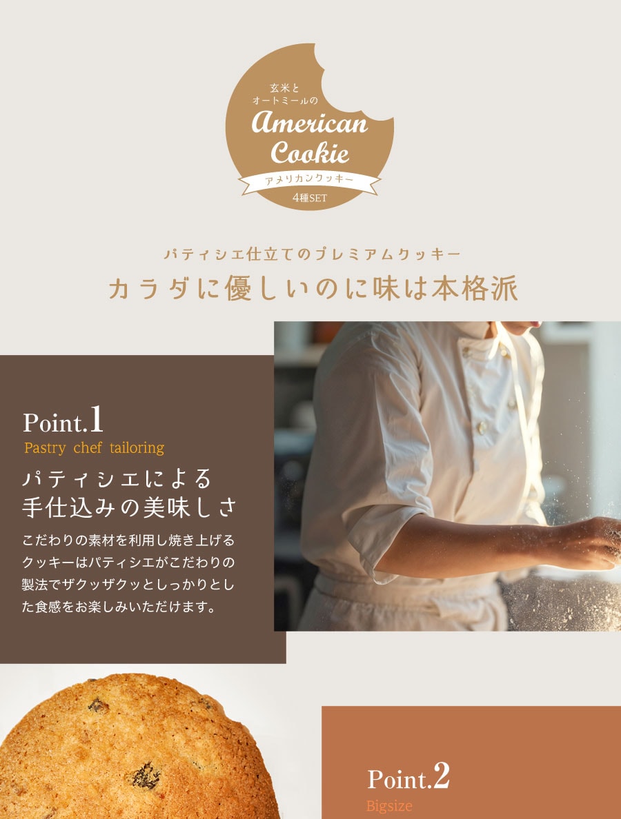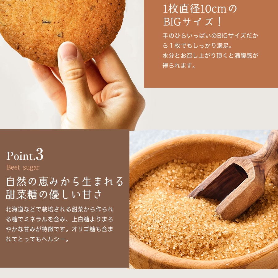 1枚約10cmのビッグサイズ!ざくっざくっとした食感で食べ応え抜群!小麦粉やバターを使わずにスーパーフードであるオーツ麦や玄米を使用して焼き上げました。食べるほどキレイになれるカラダに良いスイーツです。