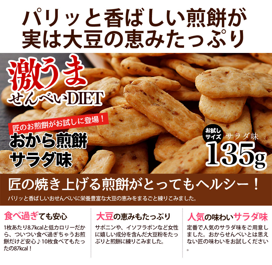 | 内容量 | 【豆乳おからクッキー(ハード)】180g 【トリプルダイエットクッキー】180g 【冬の豆乳おからクッキー(ソフトタイプ)】180g 【マンナンラスク胚芽プラス】170g 【大麦と果実のソイキューブ】170g 【おからせんべい匠(サラダ味)】135g 【さくさくコンニャクのじゃがチップス】135g 【ナチュラルチアクッキープレーン】100g 【ナチュラルチアクッキーレモン】100g |