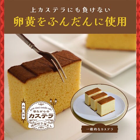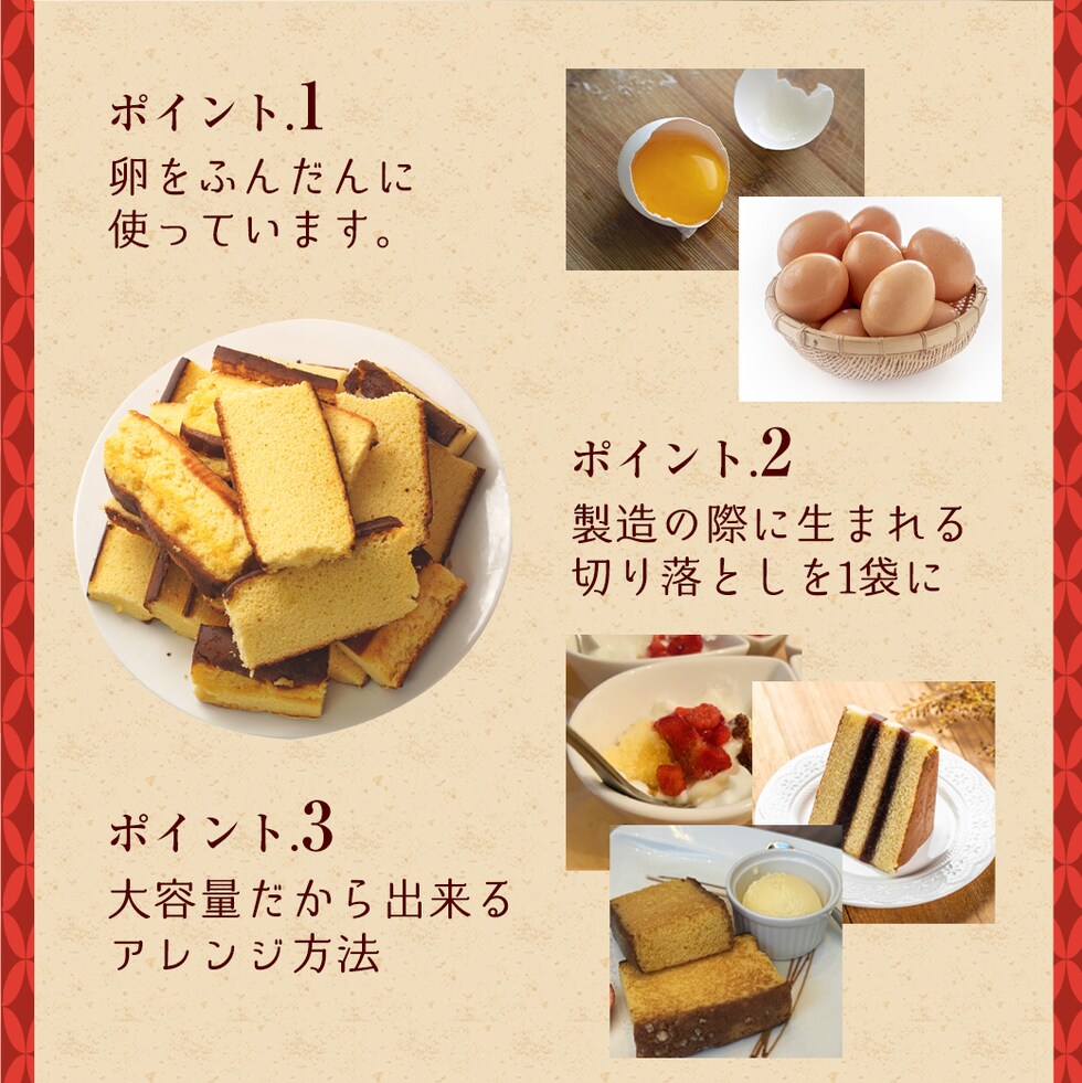 | 昔ながらの製法で作った本格カステラの切り落としを訳あり徳用パックで袋詰めしました! 熟練の職人が手作りで作っているため、限られた数のみの限定販売となっています。カステラの製造の際に出る切れ端だからこそのお買い得商品です。 |