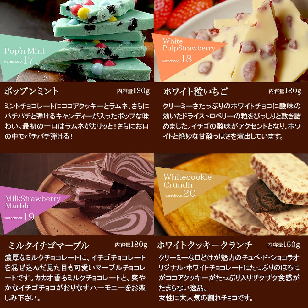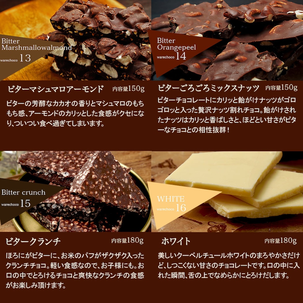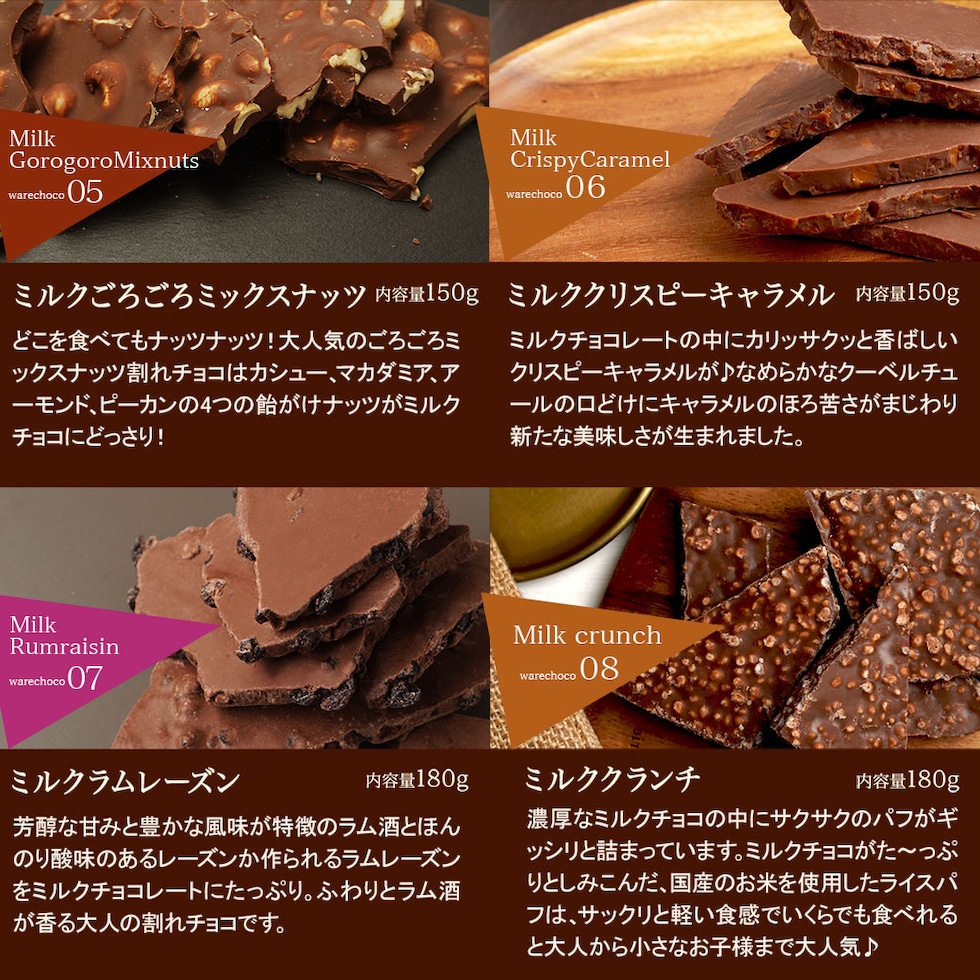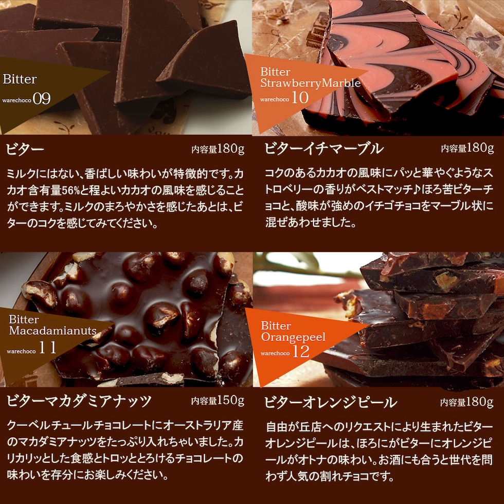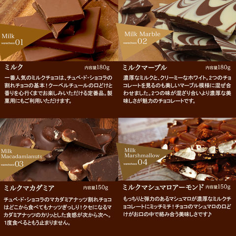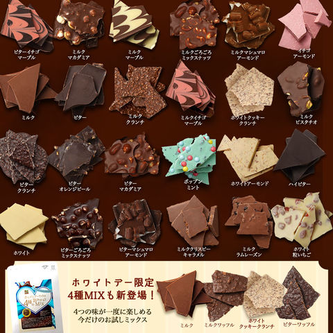 | 原材料 | 【ミルク】砂糖、全粉乳、ココアバター、カカオマス/乳化剤、香料 【ビター】カカオマス、砂糖、ココアバター/乳化剤、香料 【ホワイト】砂糖、ココアバター、脱脂粉乳、ホエイパウダー、無水乳脂肪、デキストリン/乳化剤、香料 【ミルクマーブル】砂糖、ココアバター、全粉乳、カカオマス/乳化剤、香料 【ミルクマカダミアナッツ】砂糖、全粉乳、マカダミア、ココアバター、カカオマス/乳化剤、香料 【ビターマカダミアナッツ】カカオマス、砂糖、マカダミア、ココアバター/乳化剤、香料 【ミルクマシュマロアーモンド】砂糖、ココアバター、マシュマロ、全粉乳、アーモンド、カカオマス/乳化剤、香料 【ビターマシュマロアーモンド】カカオマス、砂糖、マシュマロ、アーモンド、ココアバター、バニラ/乳化剤 【ビターイチゴマーブル】カカオマス、砂糖、ココアバター、全粉乳、乳脂肪/乳化剤、香料、食用赤色102号 【ビターオレンジピール】カカオマス、砂糖、オレンジピール、ココアバター/乳化剤、香料、酸味料、保存料(一部に大豆・オレンジ・乳成分を含む) 【ごろごろMIXナッツミルク】砂糖、ココアバター、アーモンド、全粉乳、カシューナッツ、ピーカンナッツ、水あめ、カカオマス、マカダミア、食物油脂、(一部に大豆、乳成分を含む) 【ごろごろMIXナッツビター】砂糖、カカオマス、アーモンド、カシューナッツ、ピーカンナッツ、水あめ、ココアバター、マカダミア、食物油脂/乳化剤、香料(一部に大豆、乳成分を含む) 【さくさくストロベリー】砂糖、ココアバター、全粉乳、乳糖、乾燥いちご/着色料(ビートレッド)、乳化剤、香料、酸味料 【ミルクラムレーズン】砂糖、ココアバター、全粉乳、レーズン、カカオマス、粉末酒/乳化剤、香料、(一部に乳成分・大豆を含む) 【ミルククリスピーキャラメル】砂糖、ココアバター、全粉乳(国内製造)、キャラメルフレーク(砂糖、グルコースシロップ、還元乳、その他)、カカオマス/乳化剤、香料、(一部に大豆・乳成分・小麦を含む) 【ミルククランチ】砂糖、ココアバター、全粉乳、カカオマス、ライスパフ/乳化剤、香料 【ビタークランチ】カカオマス、砂糖、ライスパフ、ココアバター/乳化剤、香料 【ミルクピスタチオ】砂糖(外国製造)、ココアバター、乳糖、ピスタチオ、全粉乳、カカオマス、/乳化剤、香料 【ポップンミント】全粉乳(国内製造)、ココアバター、砂糖、クランチビスケット、水飴、乳糖、白ざらめ糖/香料、乳化剤、着色料(青1号、黄4号)、炭酸ガス、(一部に乳成分・小麦・大豆を含む) 【ホワイトアーモンド】砂糖、ココアバター、アーモンド、脱脂粉乳、ホエイパウダー、無水乳脂肪、デキストリン/乳化剤、香料 【イチゴアーモンド】砂糖、ココアバター、全粉乳、アーモンド、乳糖/着色料(ビートレッド)、乳化剤、香料、酸味料 |