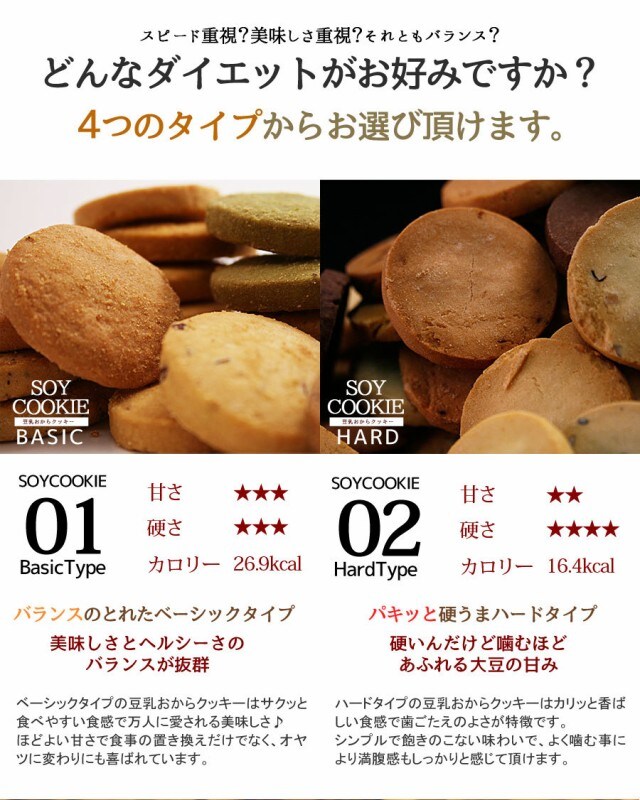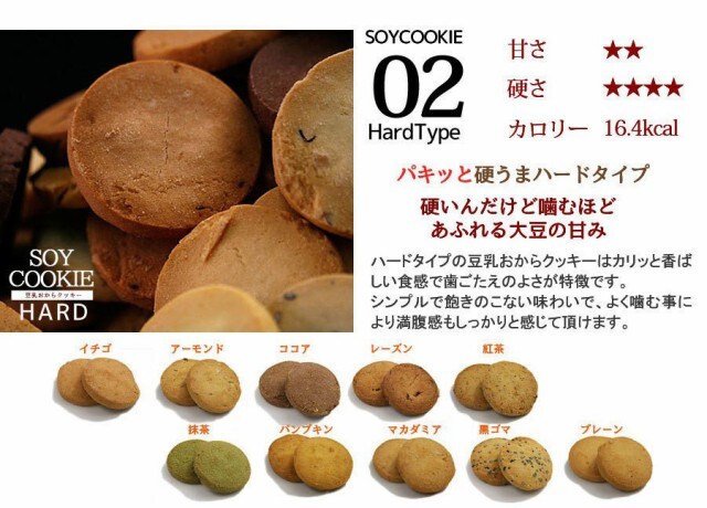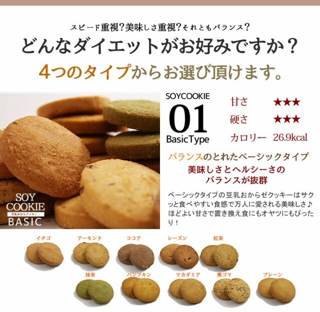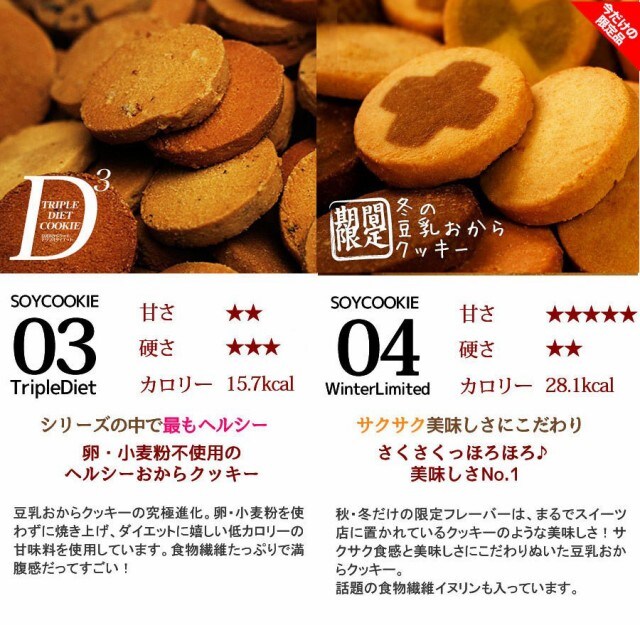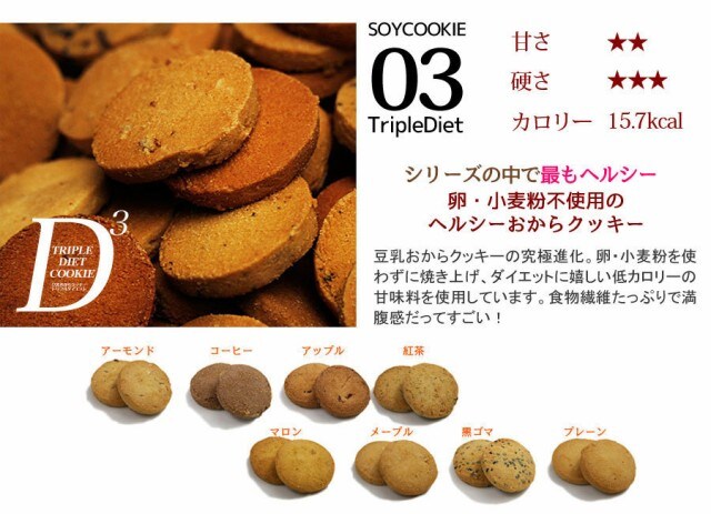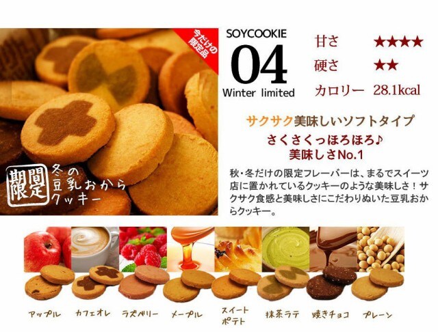 | 原材料 | 小麦粉(国内製造)、マーガリン、砂糖、乾燥おから、豆乳、グルコマンナン、金時芋ペースト、りんごジュース、果実加工品(りんご、砂糖、その他)、イヌリン、準チョコレート、フランボワーズペースト、食塩、牛乳、ココアパウダー、コーヒー豆、メープルペースト、抹茶/香料、重曹、着色料(カロテン、ベニコウジ、クチナシ、カラメル色素)、酸味料、トレハロース、(一部に小麦、乳成分を含む) |
