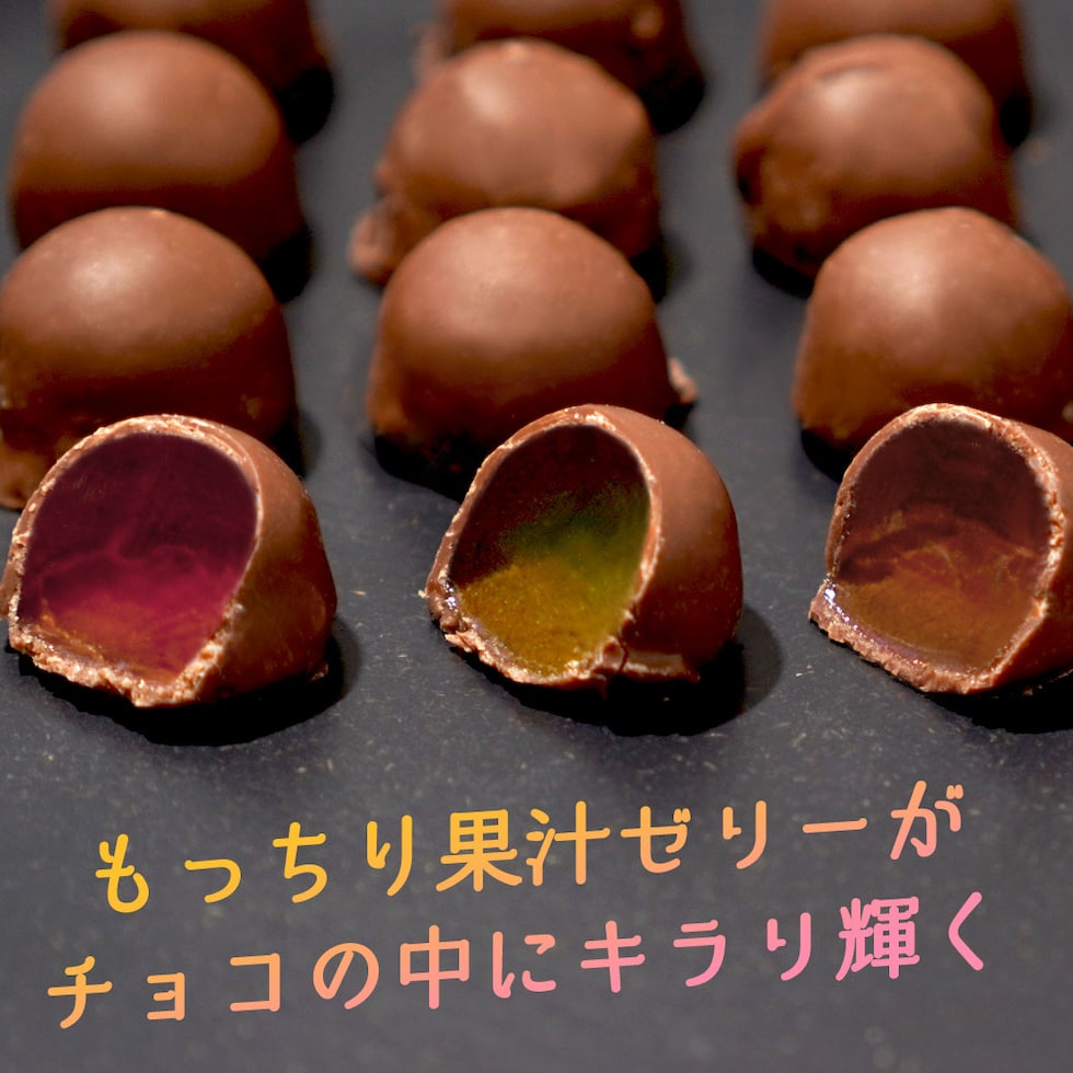 フルッチョは果汁たっぷりでもっちり食感がおいしいペクチンゼリーをチョコの王様クーベルチュールチョコで包み込みました。フルーツの甘酸っぱさとチョコの濃厚な甘さがおいしさを際立たせます。