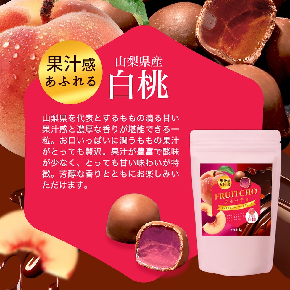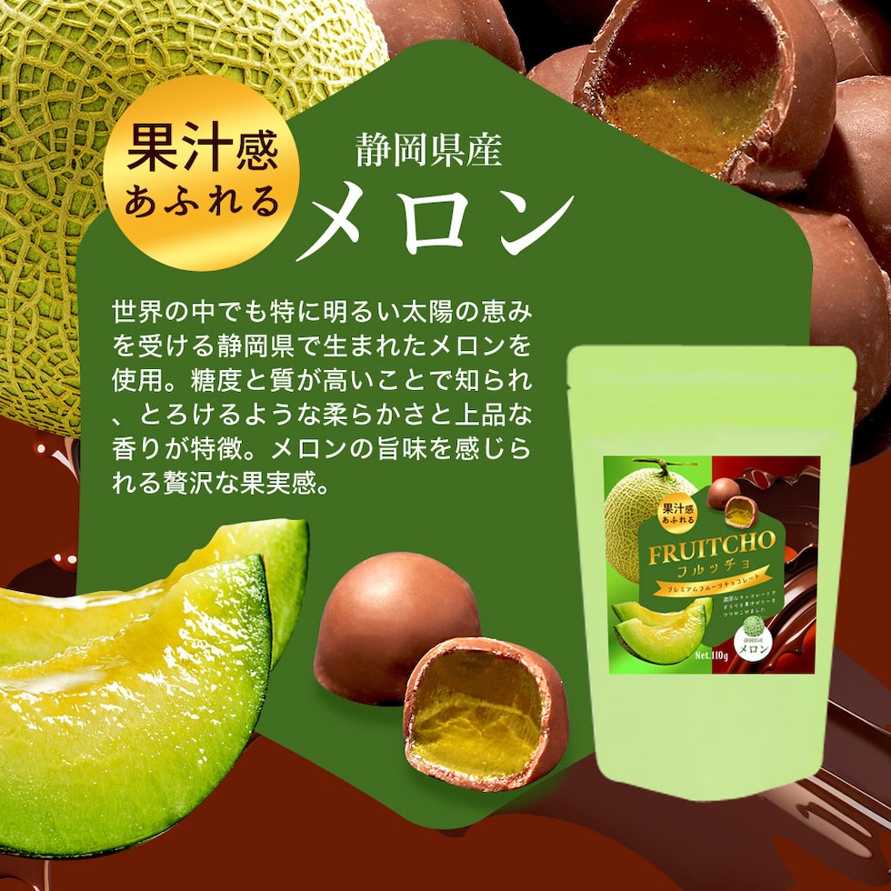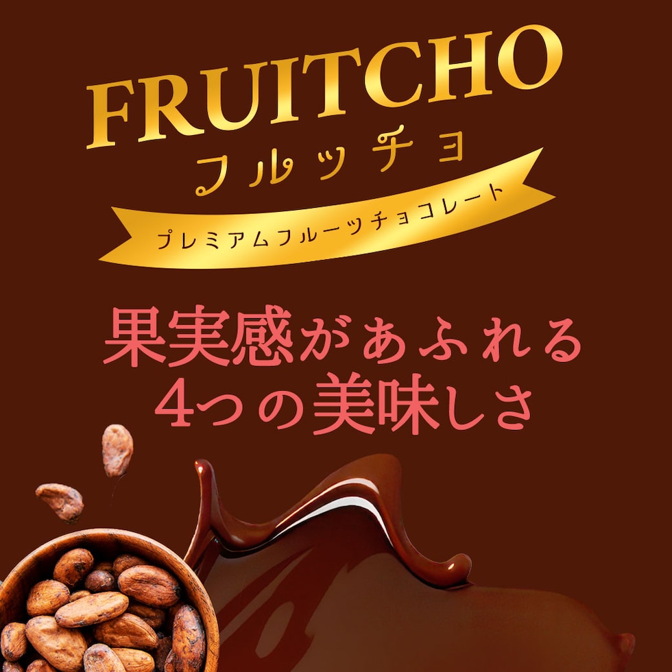 みかん、巨峰、白桃、メロンの4種から選べ、噛むほどに広がるフルーティーな香りとチョコの甘みが絶妙に調和します。