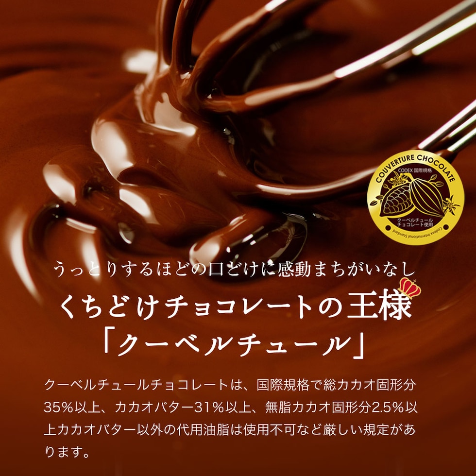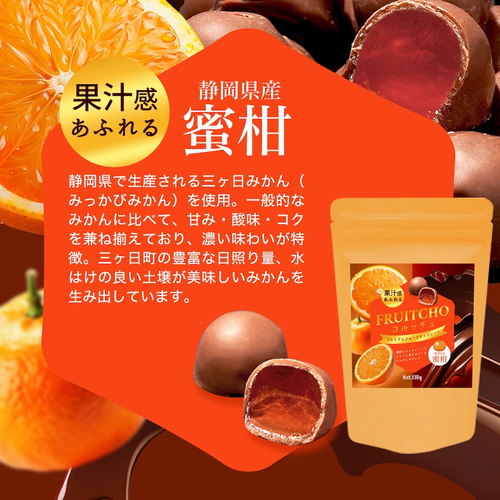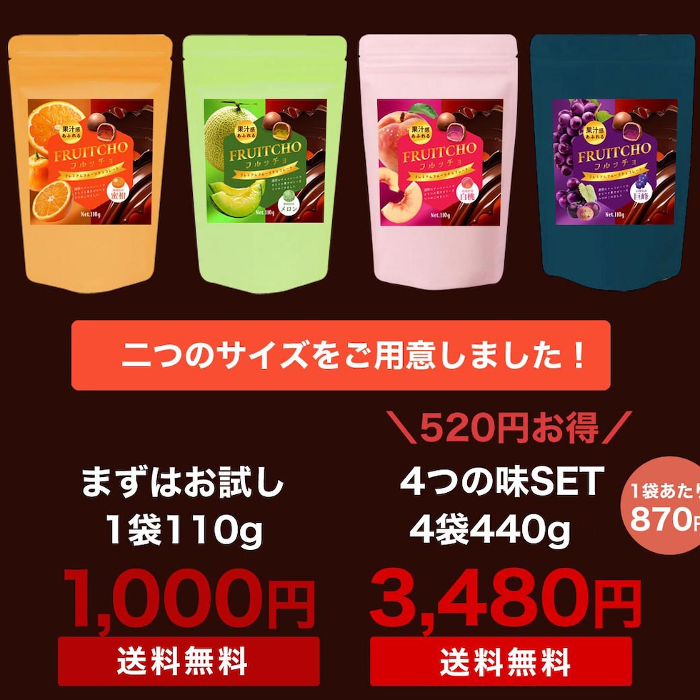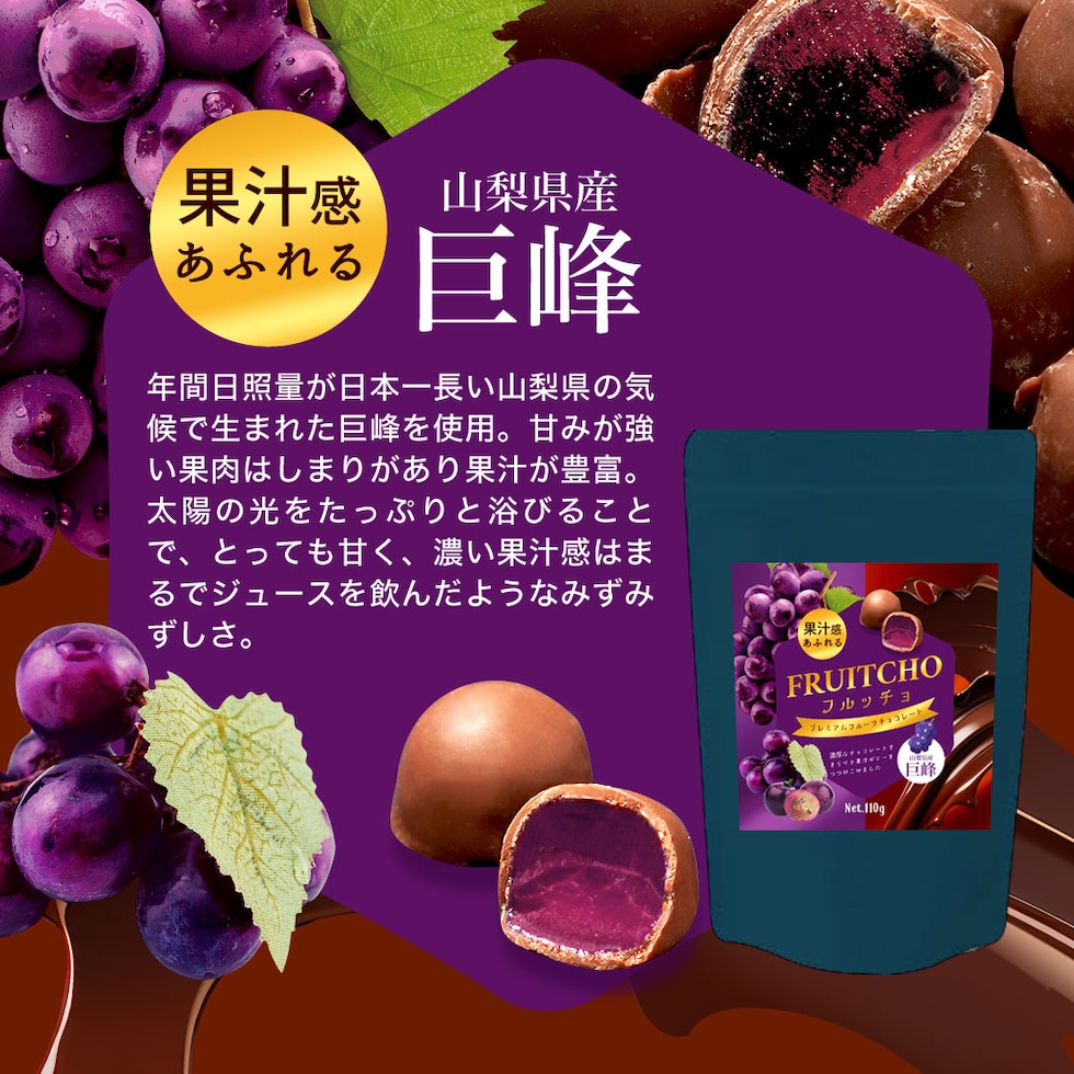 みかん、巨峰、白桃、メロンの4種から選べ、噛むほどに広がるフルーティーな香りとチョコの甘みが絶妙に調和します。