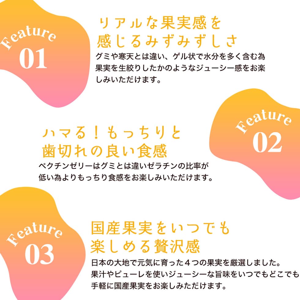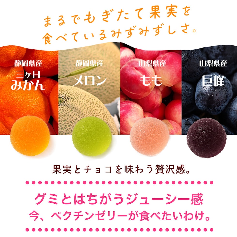 | 原材料 | 蜜柑:みかんゼリー(砂糖、水飴、ぶどう糖、果汁)(国内製造)、砂糖、ココアバター、乳糖、全粉乳、カカオマス/乳化剤、ペクチン、酸味料、香料、着色料(パプリカ)、(一部に乳成分・大豆を含む) メロン:メロンゼリー(砂糖、水飴、ぶどう糖、果汁)(国内製造)、砂糖、ココアバター、乳糖、全粉乳、カカオマス/乳化剤、ペクチン、酸味料、香料、着色料(紅麹、クチナシ青、紅花黄)、、(一部に乳成分・大豆を含む) 白桃:白桃ゼリー(砂糖、水飴、ぶどう糖、果汁)(国内製造)、砂糖、ココアバター、乳糖、全粉乳、カカオマス/乳化剤、ペクチン、酸味料、香料、着色料(紫コーン)、(一部に乳成分・大豆・ももを含む) 巨峰:巨峰ゼリー(砂糖、水飴、ぶどう糖、果汁)(国内製造)、砂糖、ココアバター、乳糖、全粉乳、カカオマス/乳化剤、ペクチン、酸味料、香料、着色料(野菜、クチナシ)、(一部に乳成分・大豆を含む) |