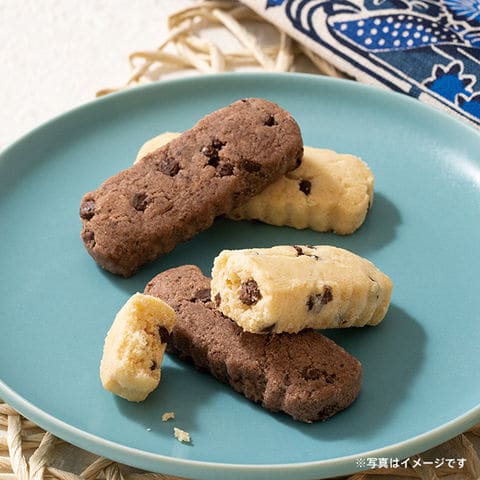 ベルギー産のダークチョコレートを練り込んだ生地にチョコレートチップを加えた「チョコレート」と、沖縄県産シークヮーサー果汁とベルギー産のホワイトチョコレートを練りこんだ生地にチョコレートチップを加えた「シークヮーサー&チョコレートチップ」の2フレーバーを詰め合わせました。