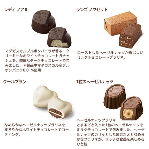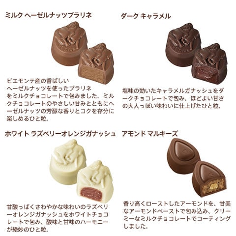 砂糖、カカオマス、ココアバター、全粉乳、ヘーゼルナッツ、アーモンド、異性化液糖、加糖練乳、乳等を主要原料とする食品、脱脂粉乳、植物油脂、バターオイル、バター、ラズベリー果汁、転化糖、米粉、粉糖、オレンジパウダー、オレンジ果汁、ラズベリーパウダー、カラメルソース、食塩、マカダミアナッツ、ピーカンナッツ、はちみつ、バニラパウダー、クリーム/グリセリン、ソルビトール、乳化剤、香料、(一部に小麦・乳成分・アーモンド・オレンジ・大豆・マカダミアナッツを含む)