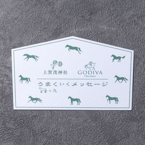 レディ・ゴディバをデザインしたホワイトチョコレートに、淡いブルーのハートが付いていたら、大あたり!とってもうまくいく一年となるでしょう。上賀茂神社のメッセージが書かれた、馬が9頭走っていく、で”うまくいく”と、シャレの効いた絵馬形カードは、午年のお守り代わりにお楽しみください。