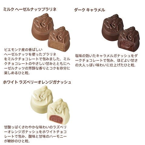 砂糖、カカオマス、ココアバター、全粉乳、ヘーゼルナッツ、異性化液糖、乳等を主要原料とする食品、加糖練乳、脱脂粉乳、ラズベリー果汁、バターオイル、バター、転化糖、オレンジパウダー、オレンジ果汁、ラズベリーパウダー、カラメルソース、食塩/グリセリン、乳化剤、香料、ソルビトール、(一部に乳成分・オレンジ・大豆を含む)