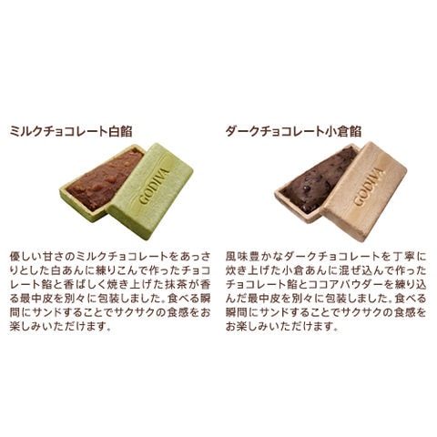 優しい甘さのミルクチョコレートをあっさりとした白餡に練りこんで作ったチョコレート餡と、香ばしく焼き上げた抹茶が香る最中皮で味わう「ミルクチョコレート白餡」と、風味豊かなダークチョコレートを丁寧に炊き上げた小倉餡に混ぜ込んで作ったチョコレート餡と、ココアパウダーを練り込んだ最中皮で味わう「ダークチョコレート小倉餡」の2種類を詰め合わせました。