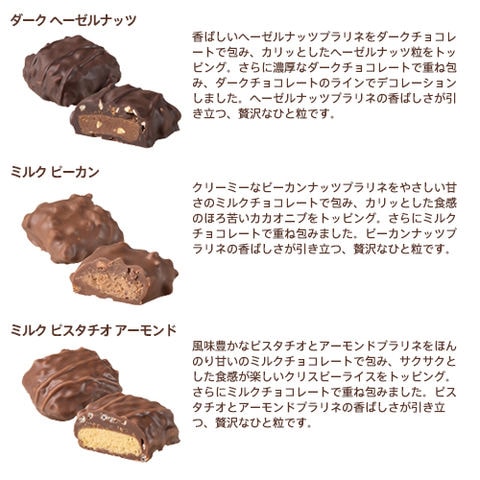 砂糖、カカオマス、全粉乳、ココアバター、ヘーゼルナッツ、植物油脂、ピーカンナッツ、米粉、ピスタチオ、カカオニブ、アーモンド、脱脂粉乳、バターオイル、食塩、異性化液糖、はちみつ/乳化剤、香料、(一部に小麦・乳成分・アーモンド・大豆を含む)