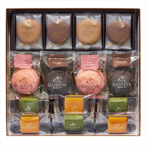 ゴディバで人気の焼き菓子「サブレショコラ」「ラングドシャクッキー」「ドームバームクーヘン」の3種を色とりどりにアソートしました。定番フレーバーと期間限定フレーバーいずれも楽しんでいただけるアソートメントです。