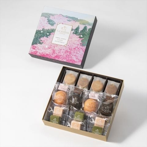 ゴディバで人気の焼き菓子「サブレショコラ」「ラングドシャクッキー」「ドームバームクーヘン」の3種を色とりどりにアソートしました。定番フレーバーと期間限定フレーバーいずれも楽しんでいただけるアソートメントです。全体に桜をあしらった春を感じるパッケージにアソートしました。