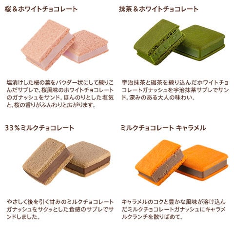 チョコレート(ベルギー製造)、小麦粉、植物油脂、ショートニング、砂糖、水飴、全卵、チョコレートコーチング、アーモンドパウダー、加糖卵黄、バター、準チョコレート、桜葉塩漬粉末、桜エキス/トレハロース、香料、乳化剤、着色料(クチナシ、赤40)、焼ミョウバン、(一部に乳成分・小麦・卵・大豆・アーモンドを含む)