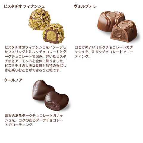 砂糖、カカオマス、全粉乳、ココアバター、アーモンド、植物油脂、ピスタチオ、キャラメルソース、バターオイル、乳等を主要原料とする食品、小麦粉、転化糖、ストロベリー果汁、脱脂粉乳、異性化液糖、ココアパウダー、ラズベリーパウダー、ヘーゼルナッツ、ストロベリーパウダー、砂糖加工品、バター、レモンパウダー、食塩、はちみつ、シナモン、マカダミアナッツ、ピーカンナッツ、バニラパウダー、米粉、クリーム/ソルビトール、グリセリン、香料、乳化剤、着色料(アカビートジュース、スピルリナ青、カロテン)、(一部に小麦・乳成分・アーモンド・大豆・マカダミアナッツを含む)