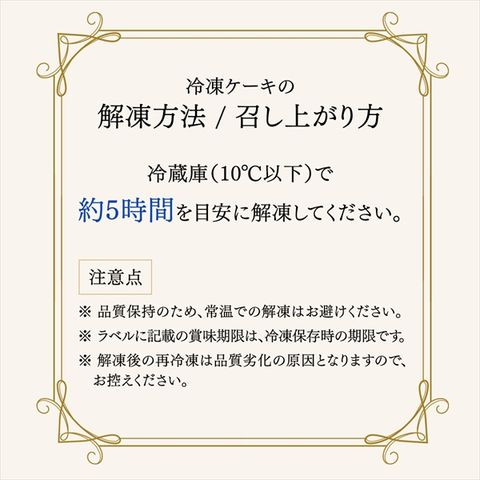 冷蔵庫で解凍し(目安:5時間)、解凍後は冷蔵庫で保管しお早めにお召し上がりください。